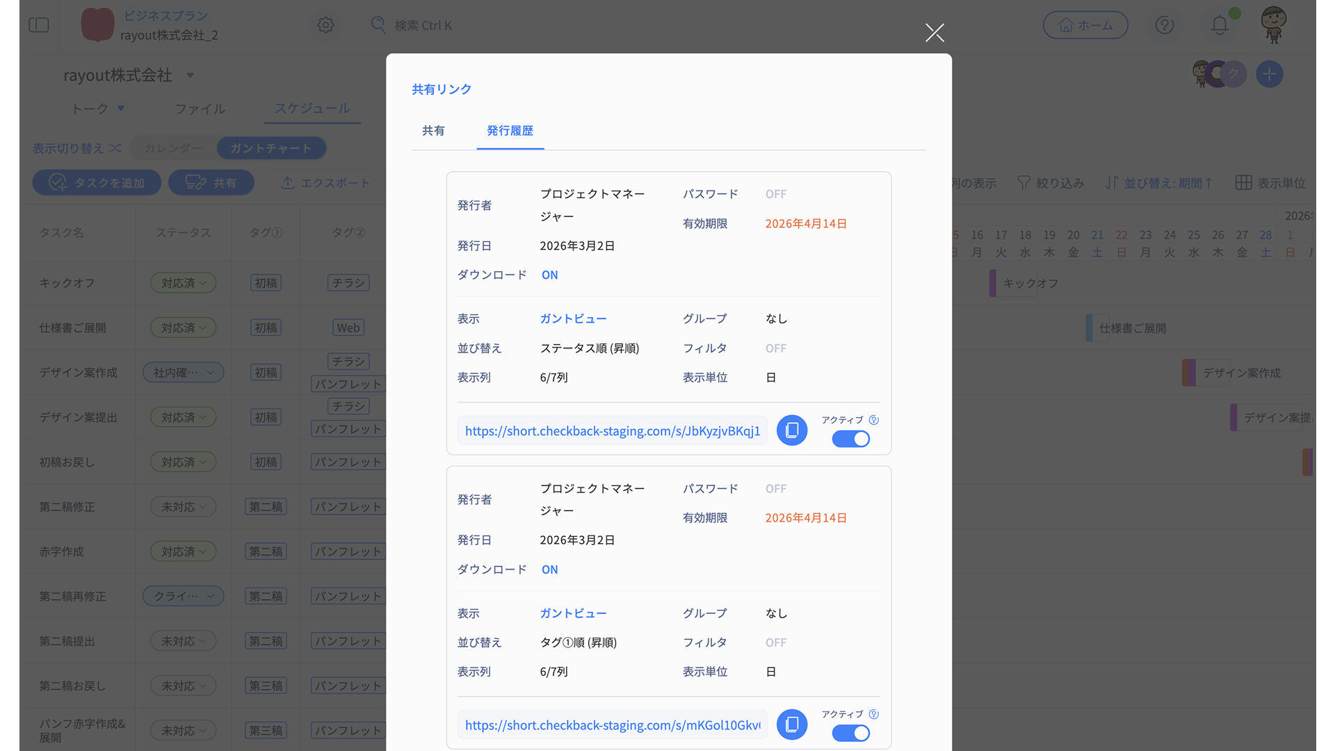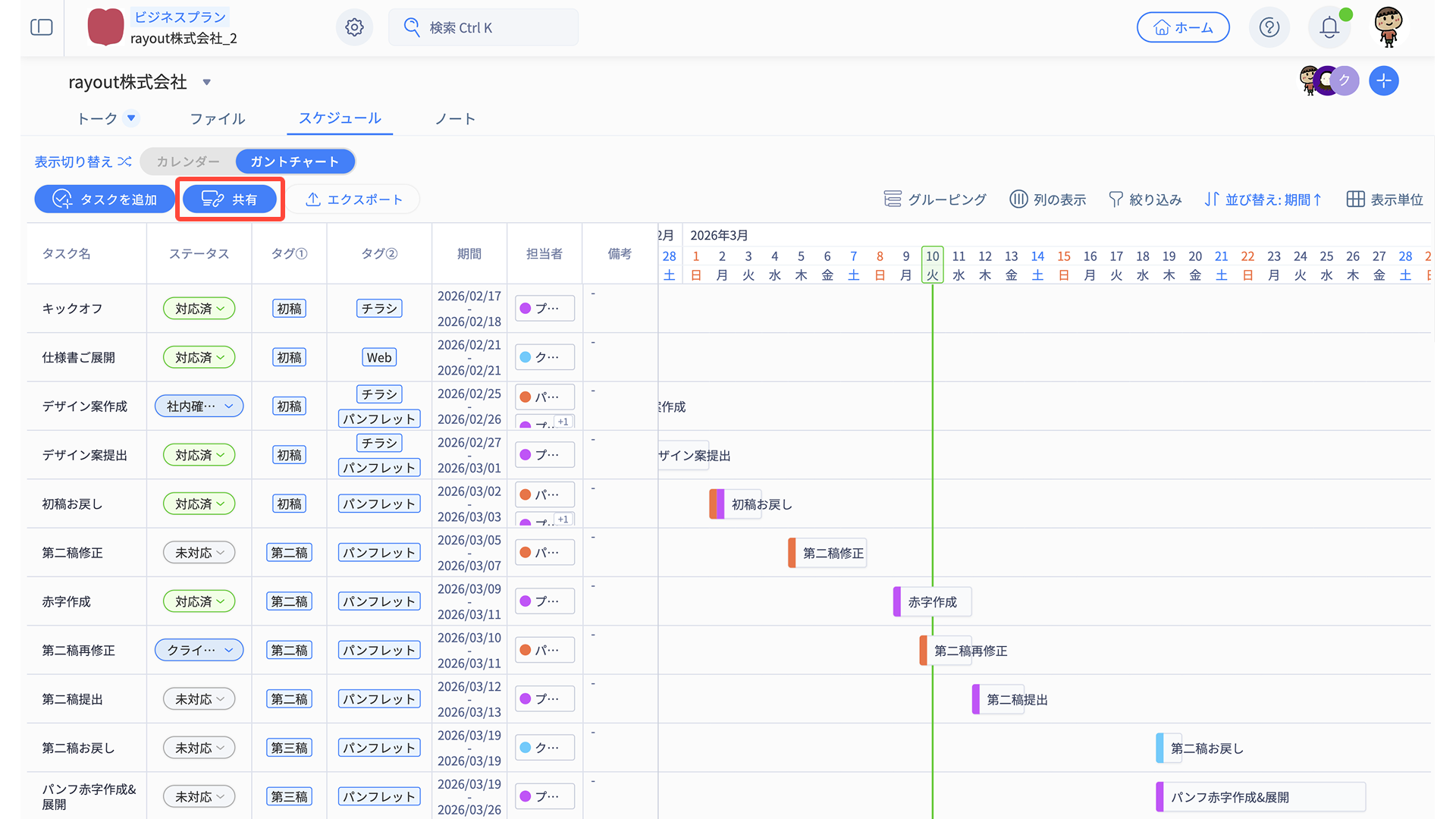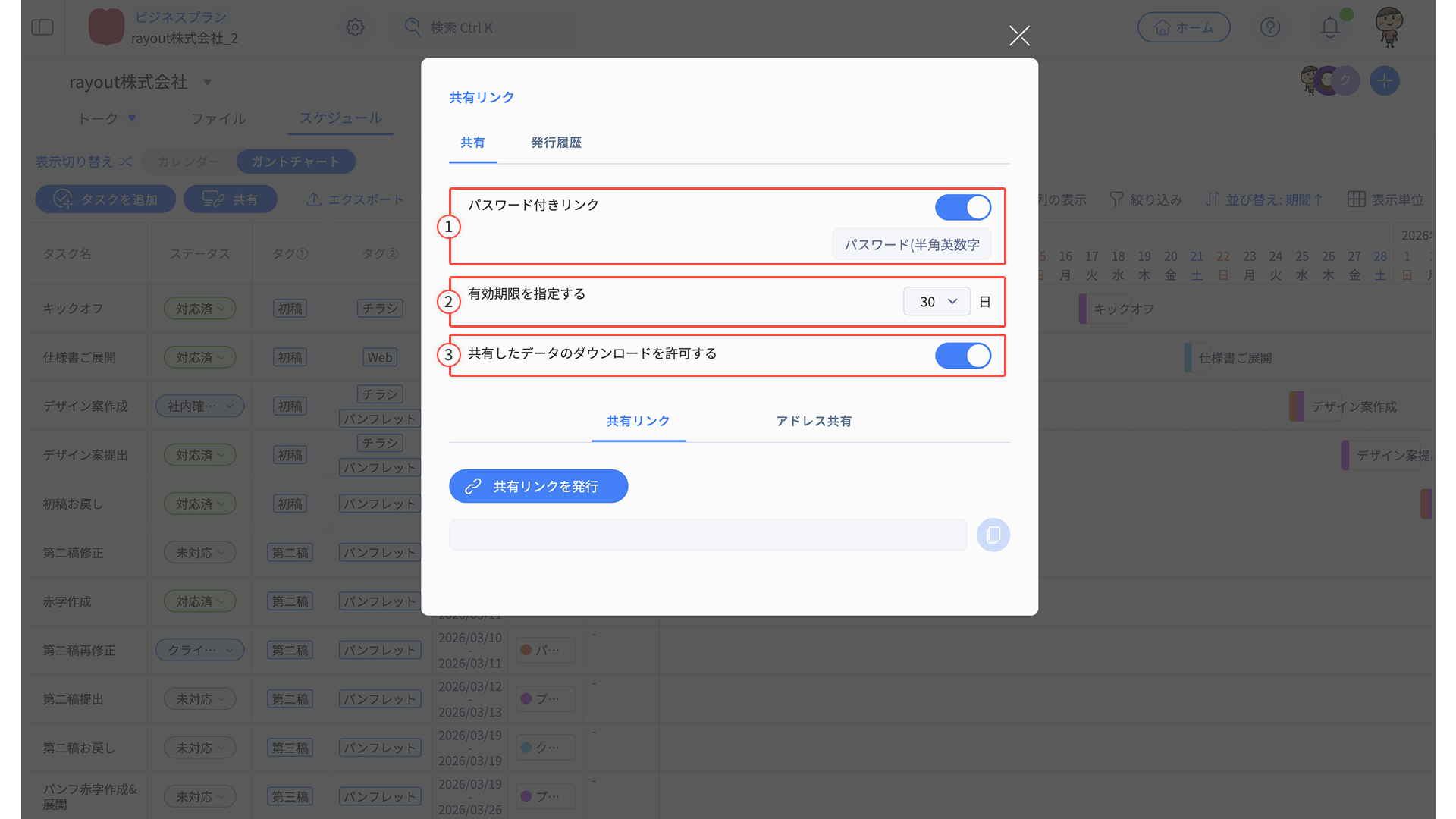 スケジュールタブの共有リンクを発行すれば、プロジェクトの進行状況を関係者に共有できます。