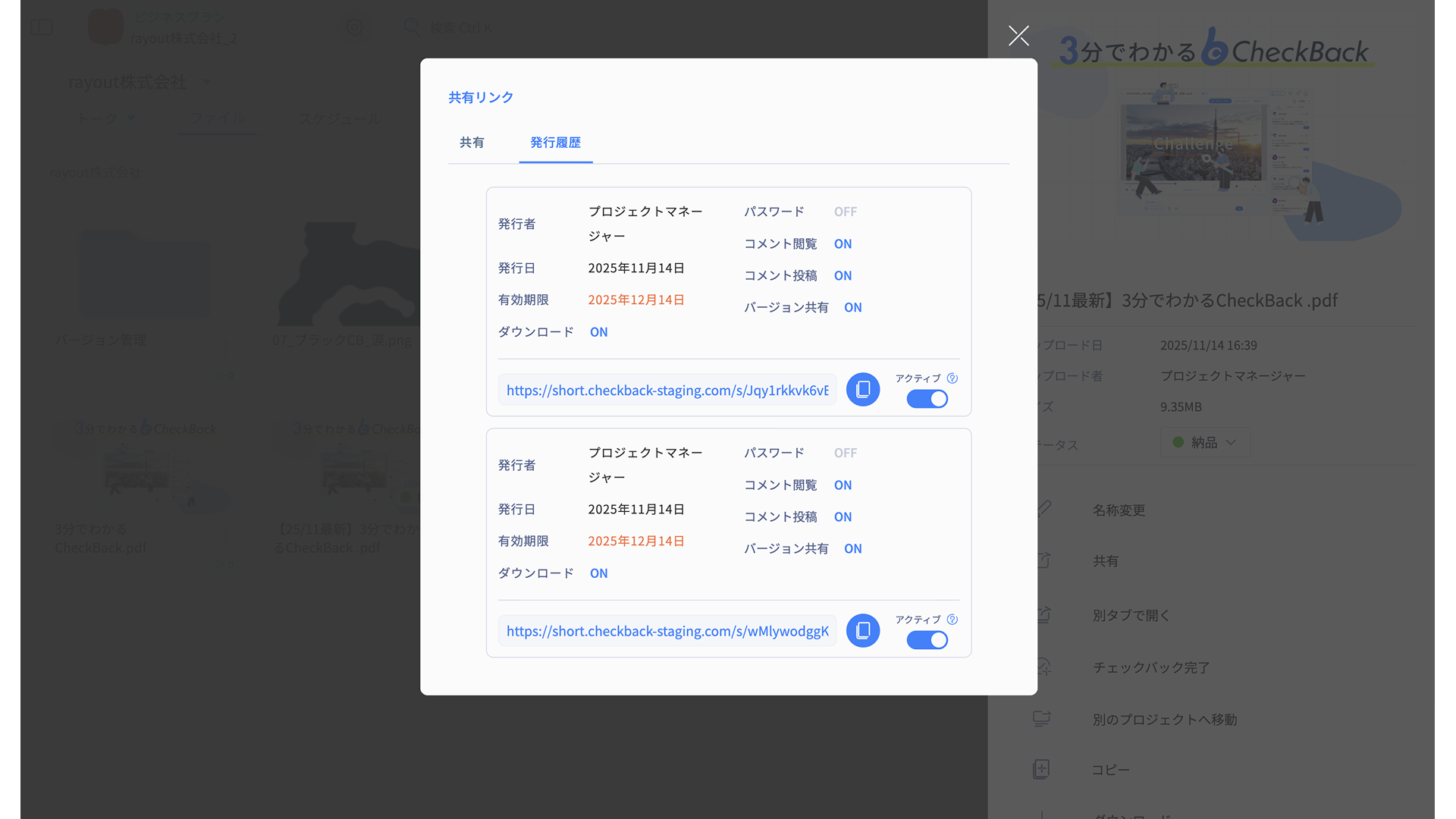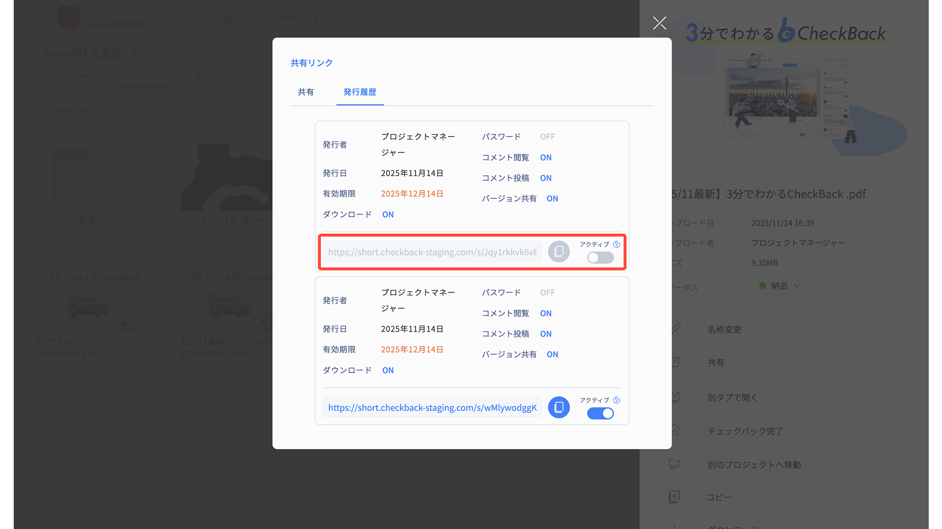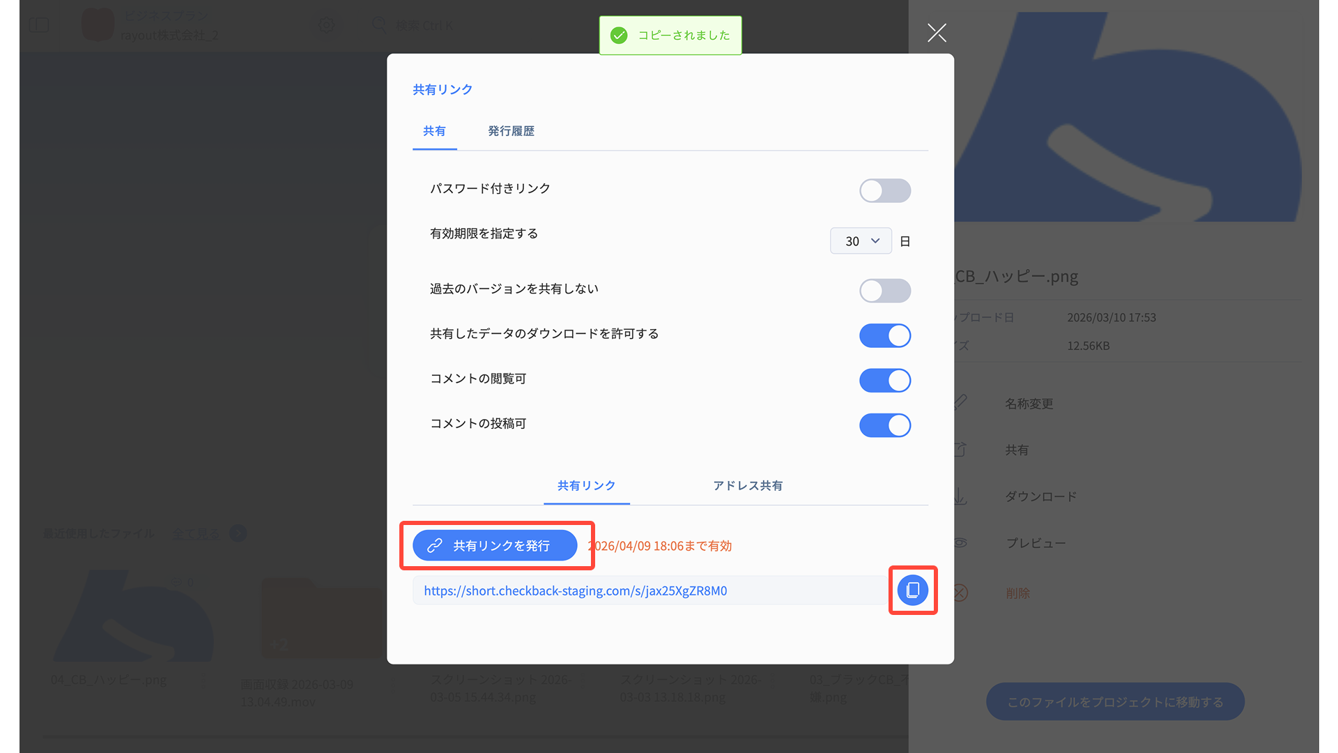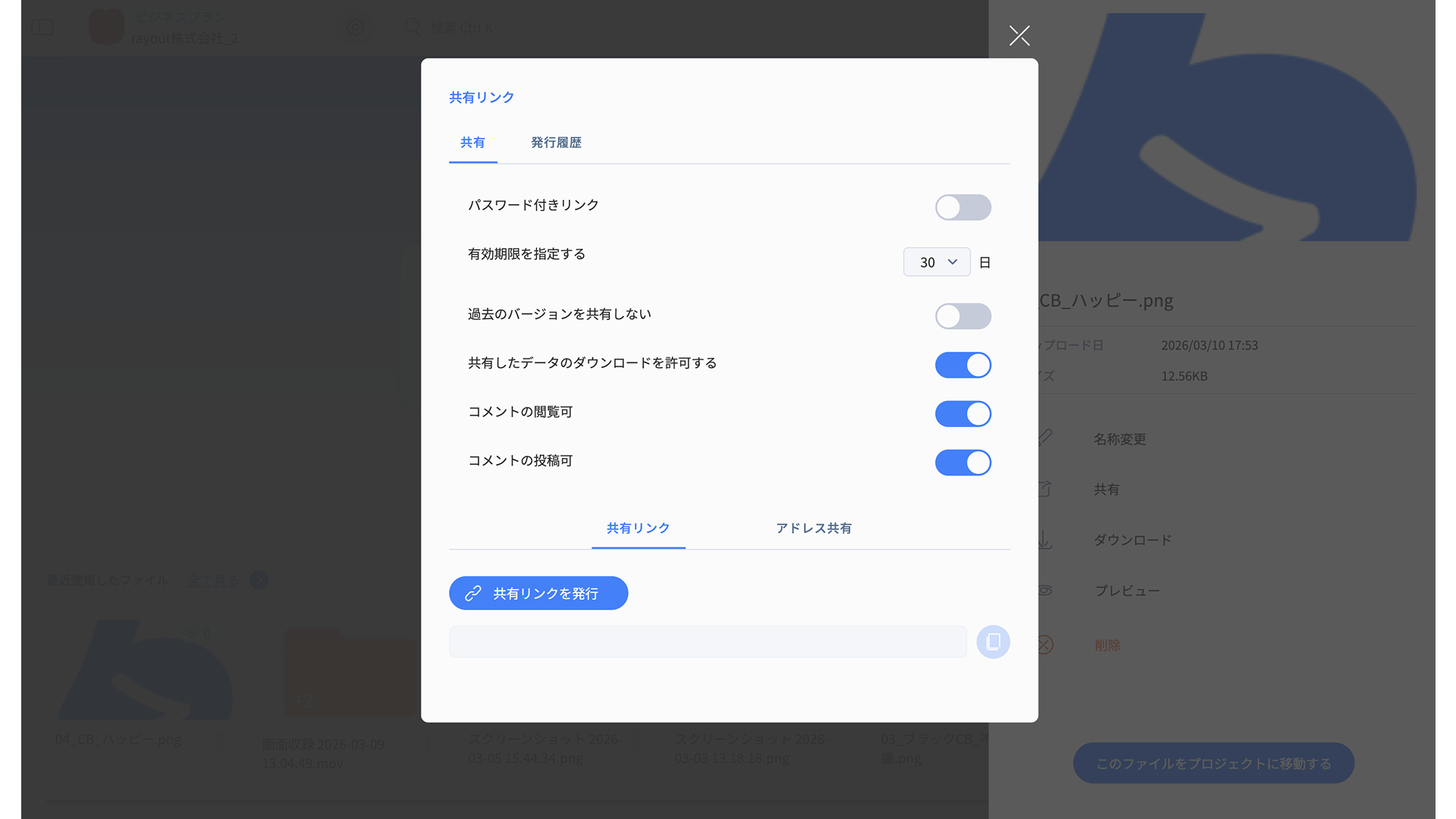 発行した共有リンクは、すべて発行履歴が保持されます。 共有リンクモーダルのタブ「発行履歴」から閲覧ができます。