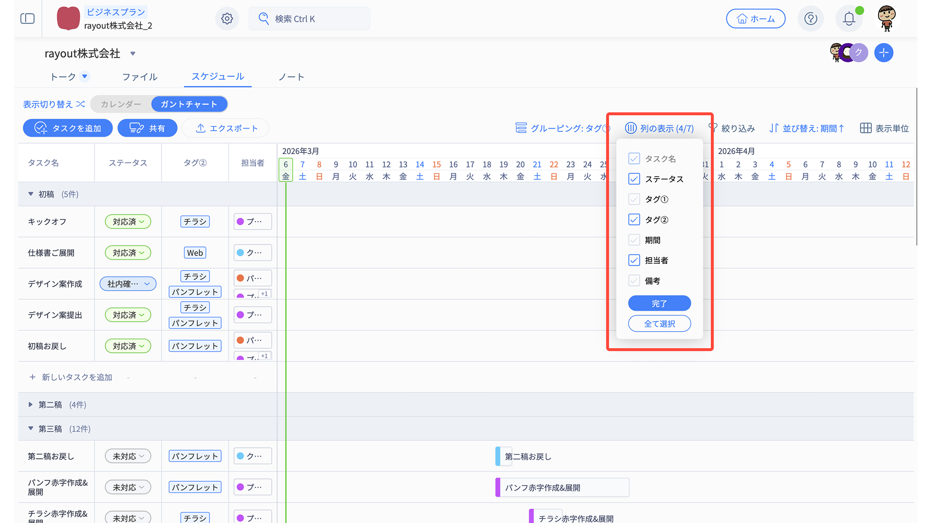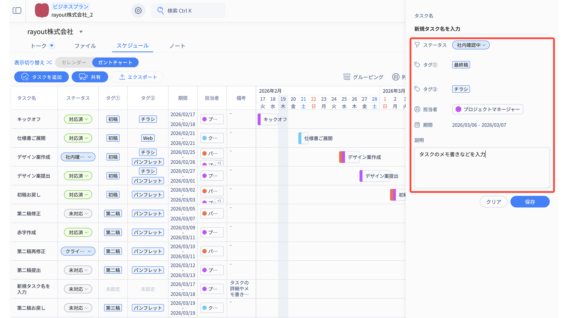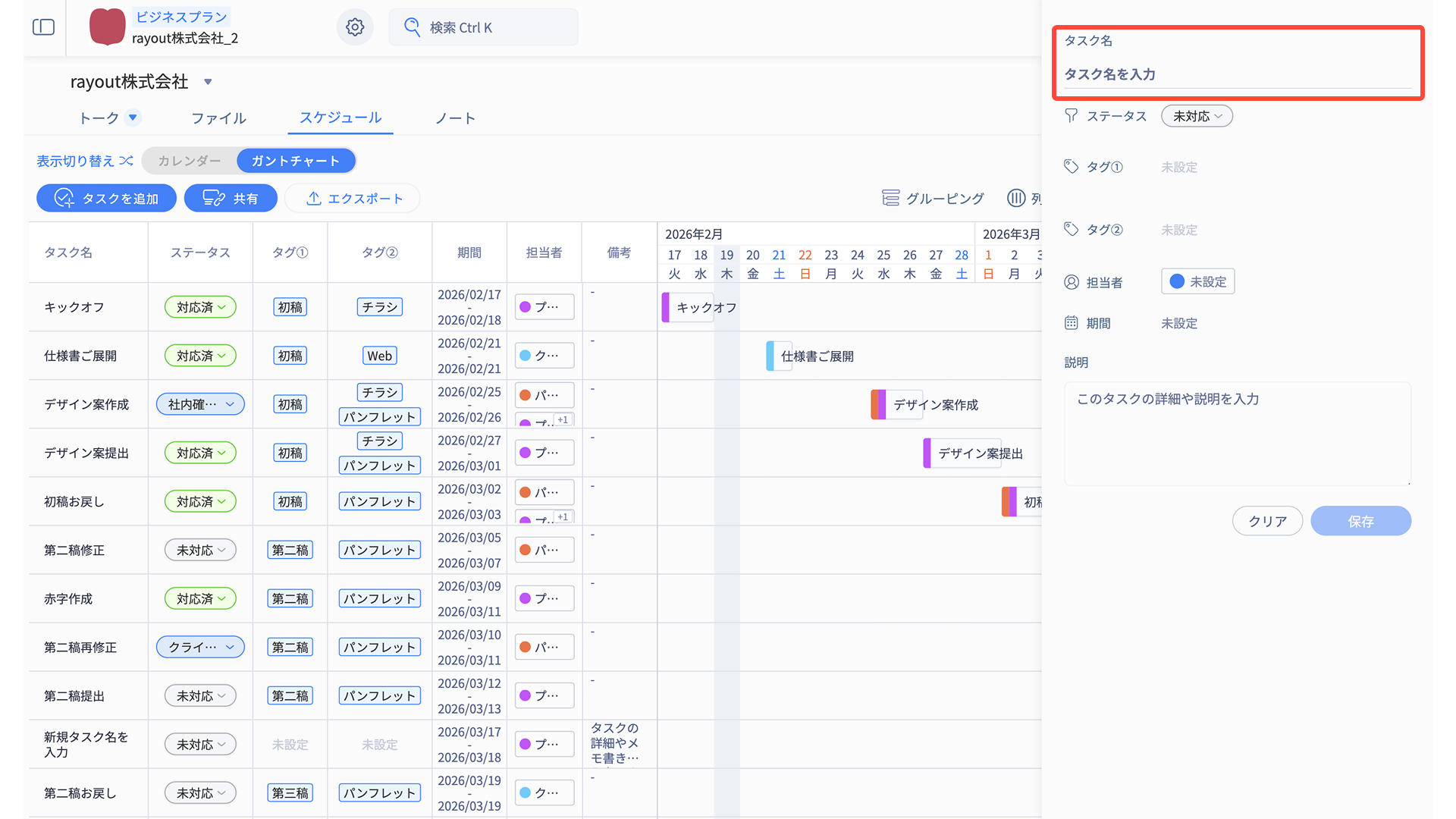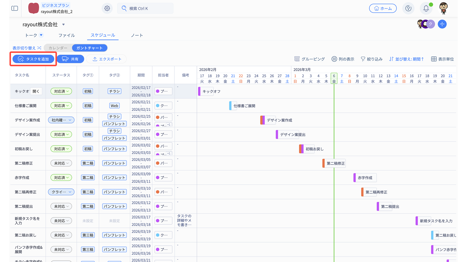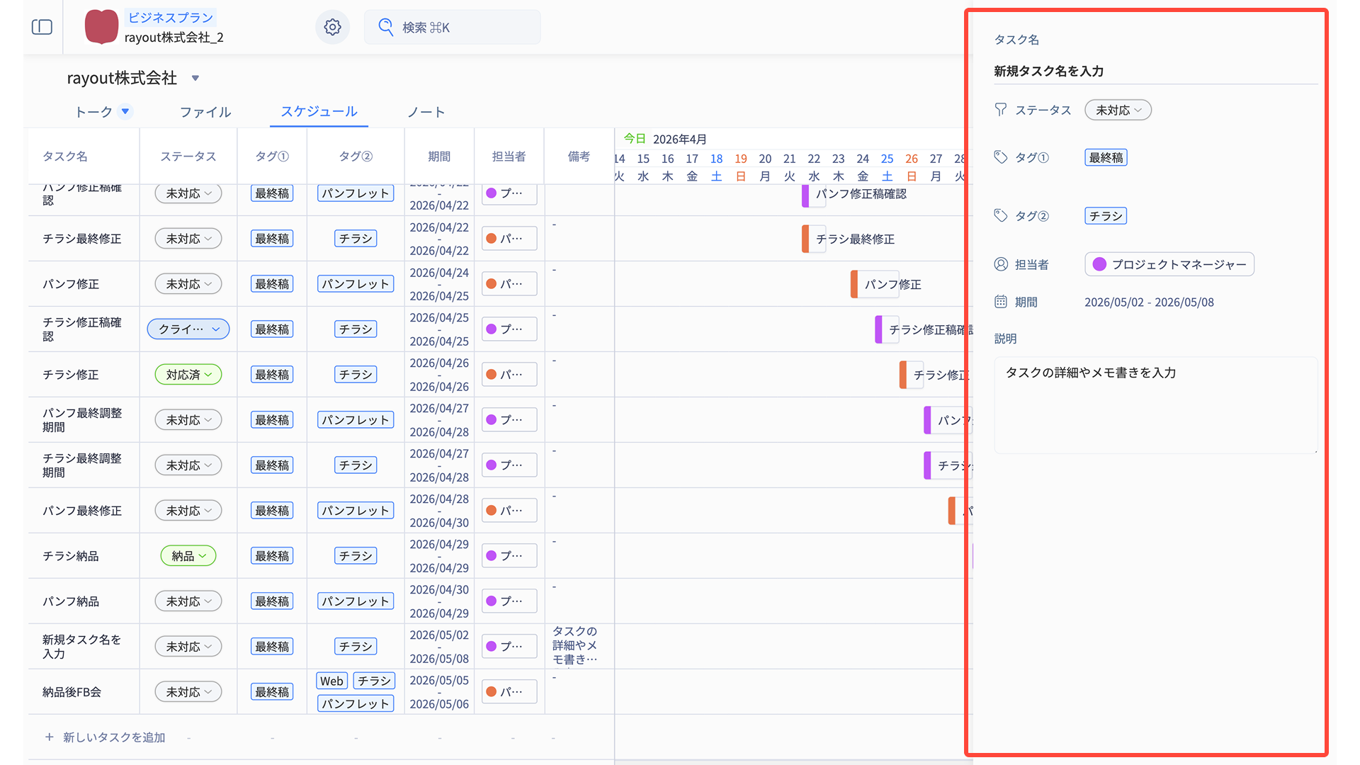 「タスク名・ステータス・タグ・期間・担当者・備考」の情報がそのまま反映されます。