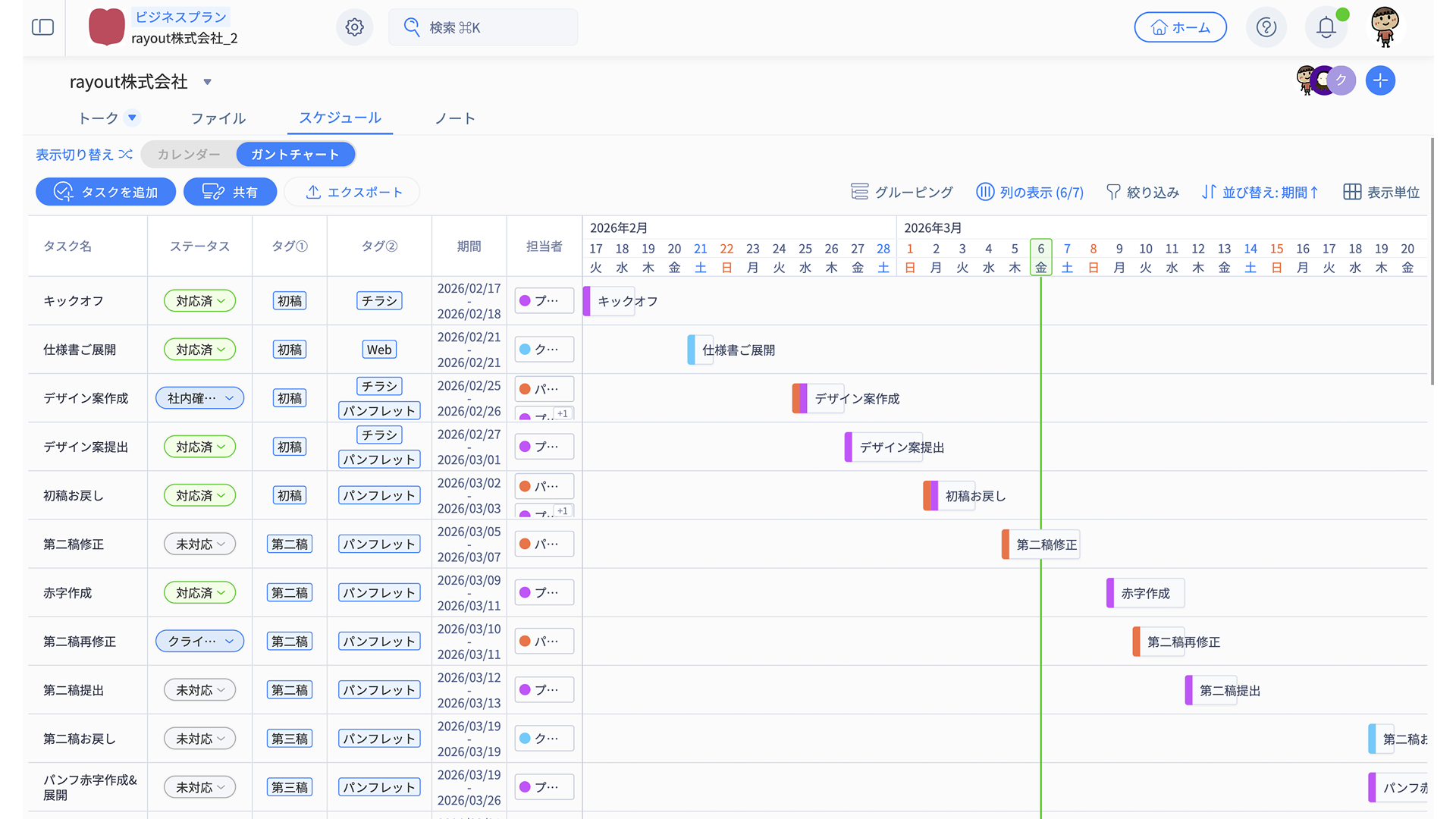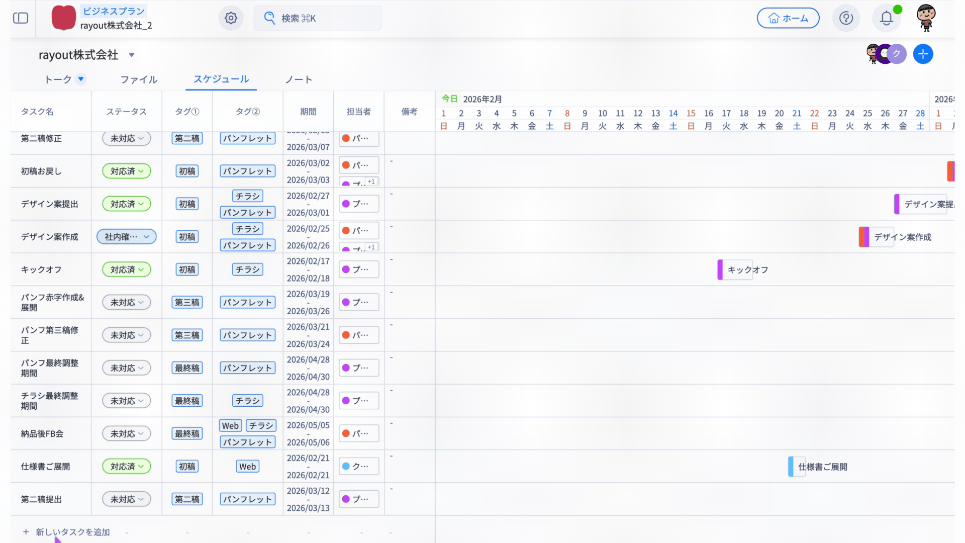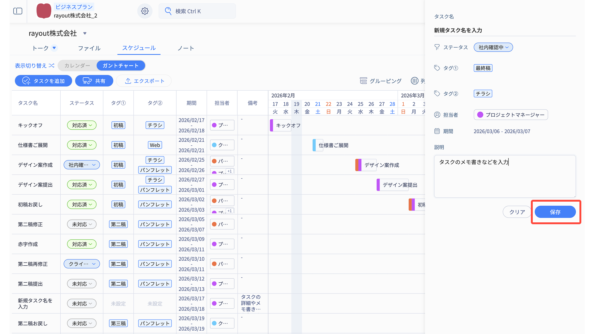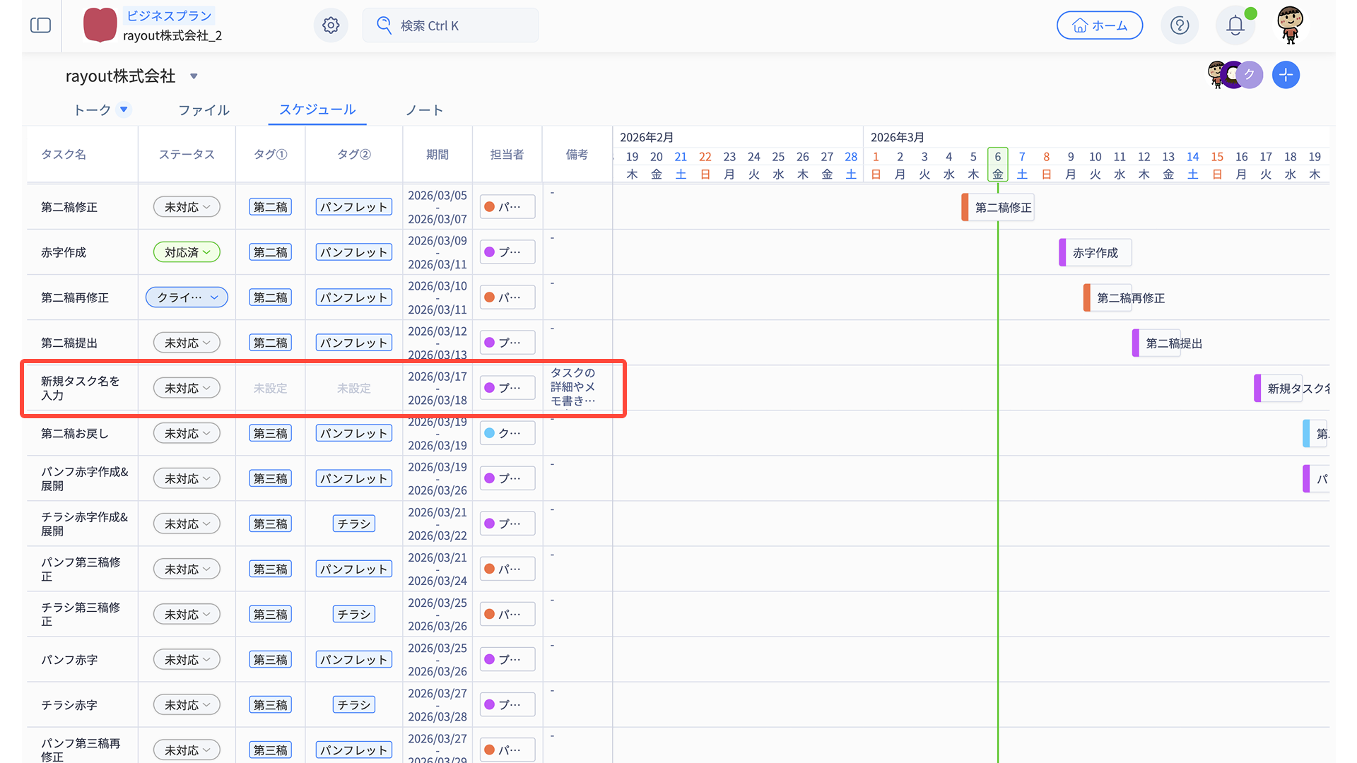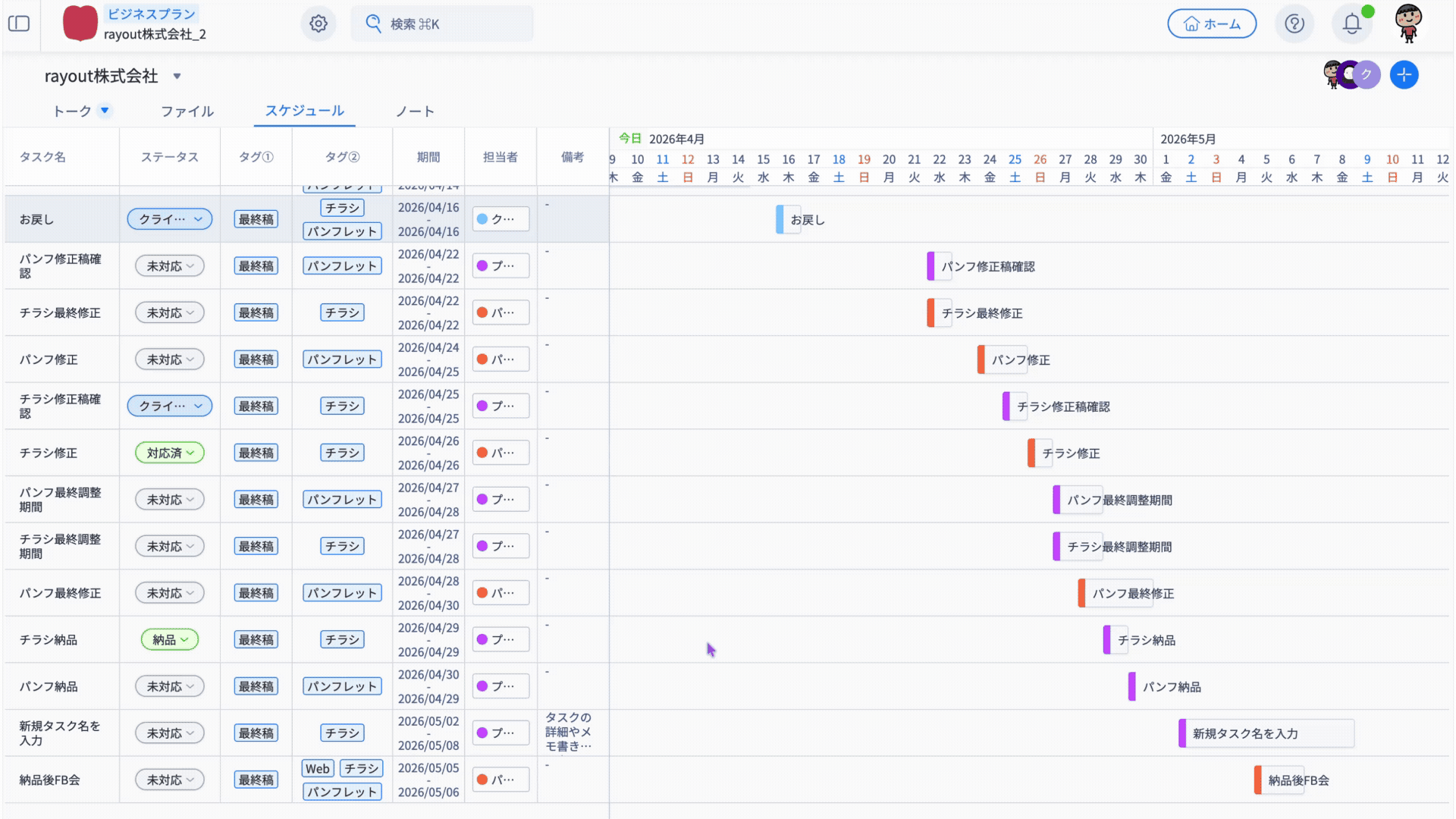 「タスク名・ステータス・タグ・期間・担当者・備考」の情報がそのまま反映されます。