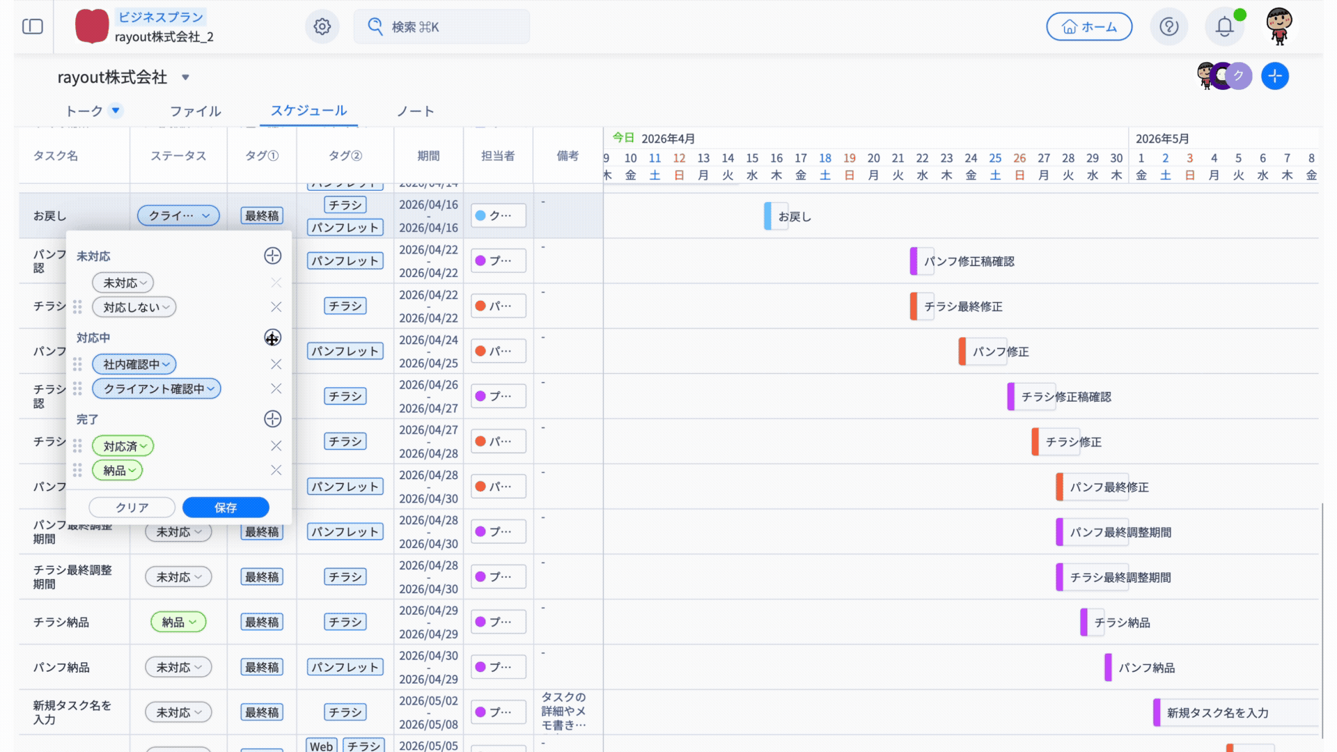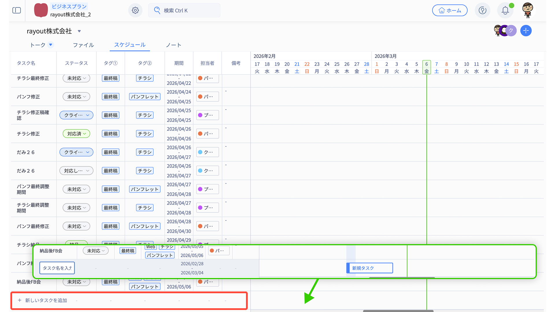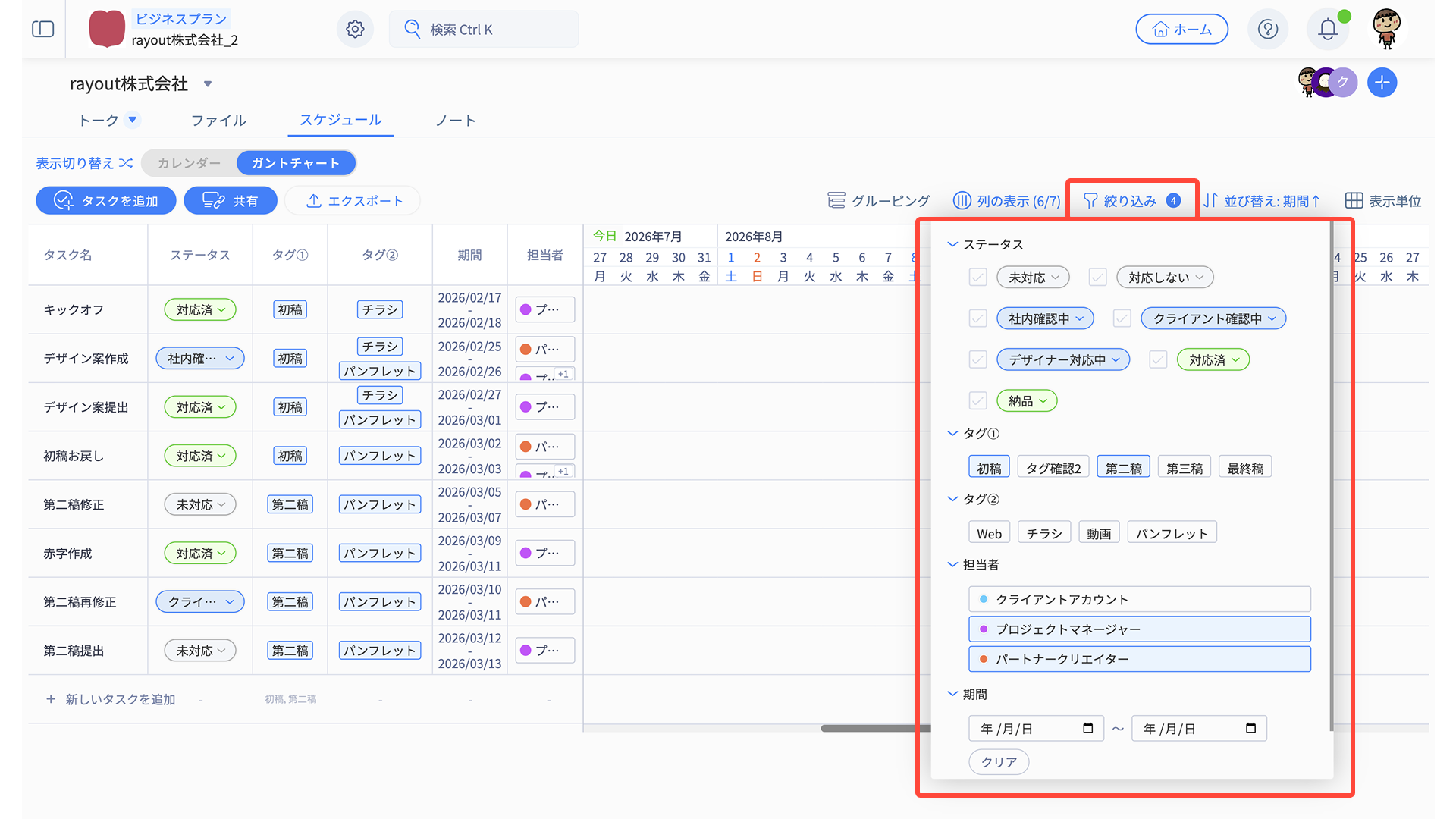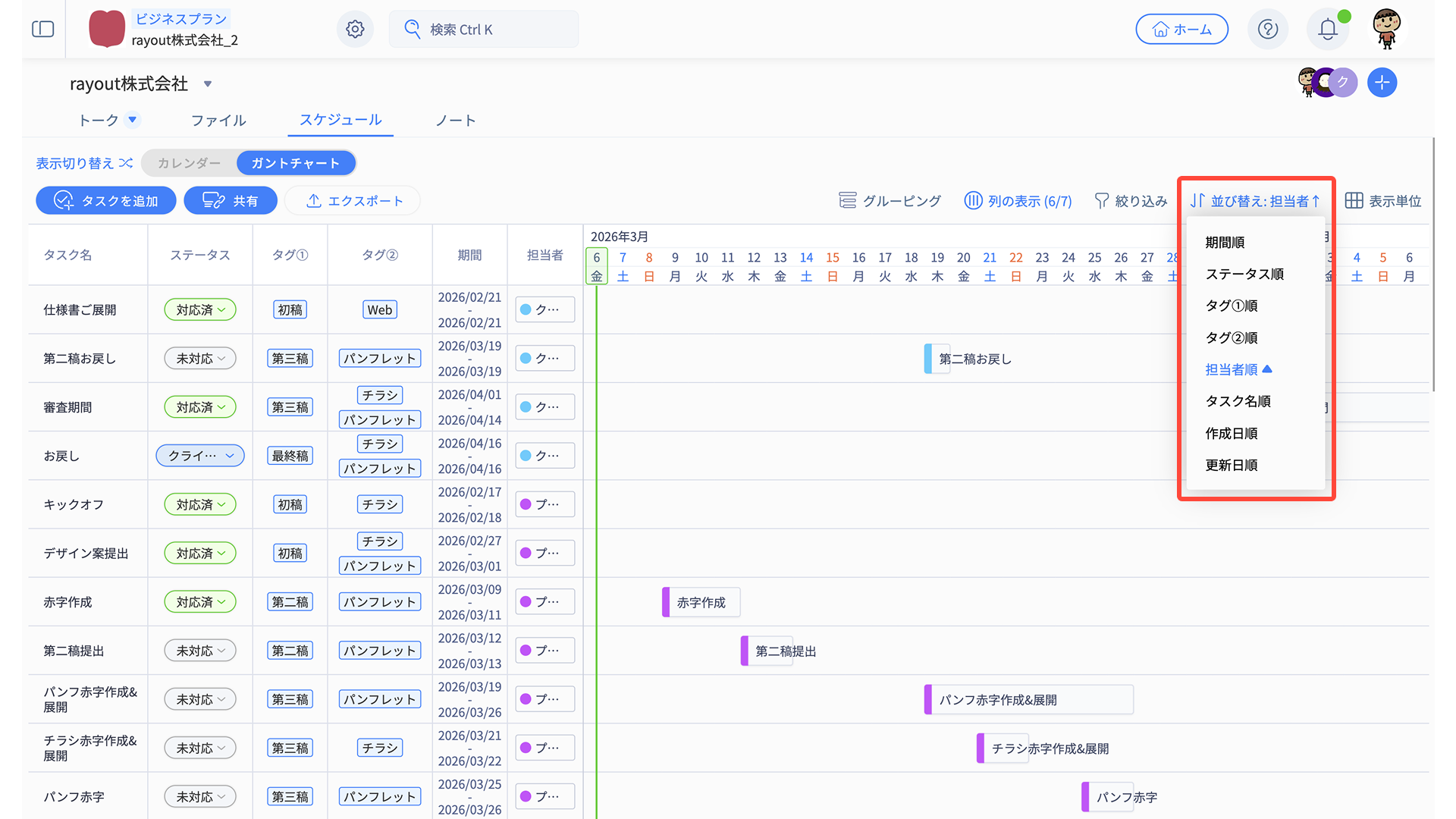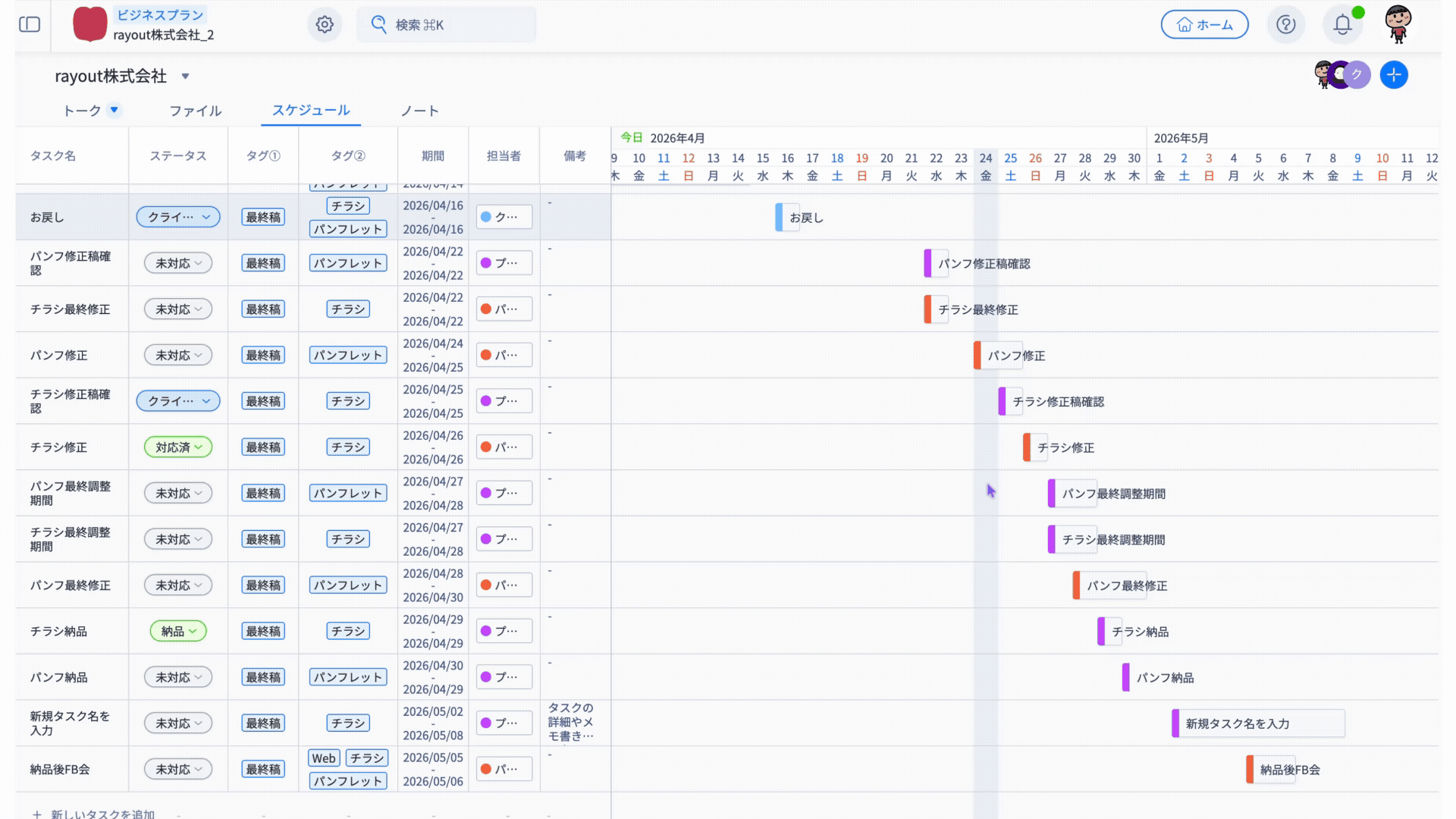 「タスク名・ステータス・タグ・期間・担当者・備考」の情報がそのまま反映されます。