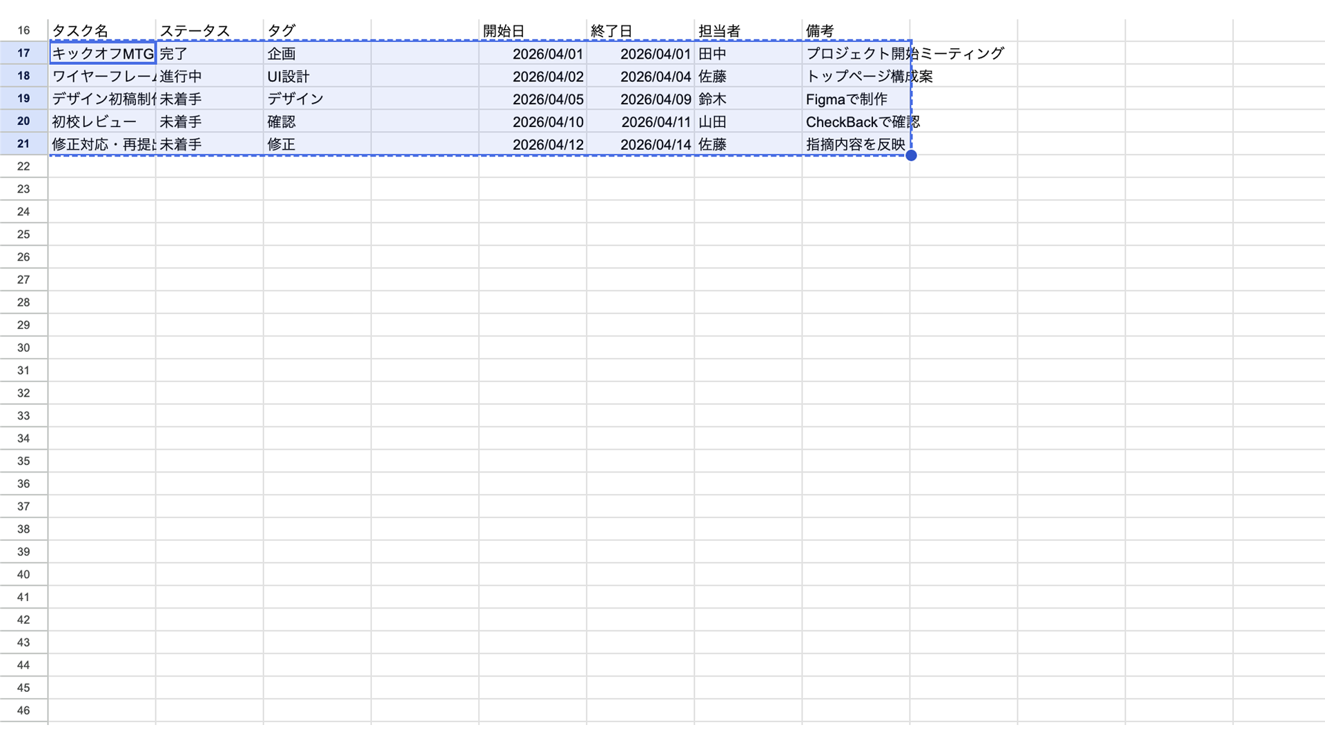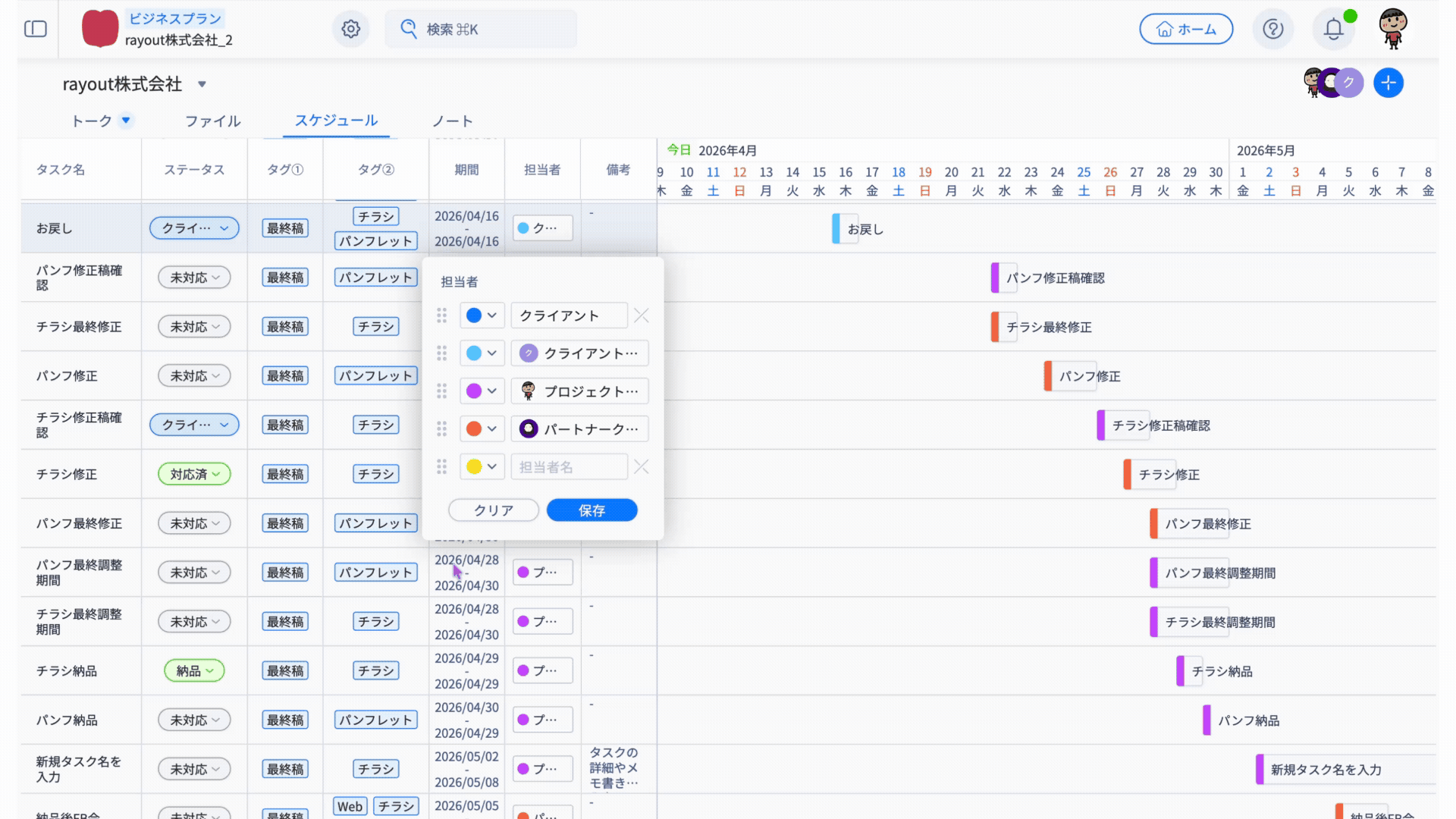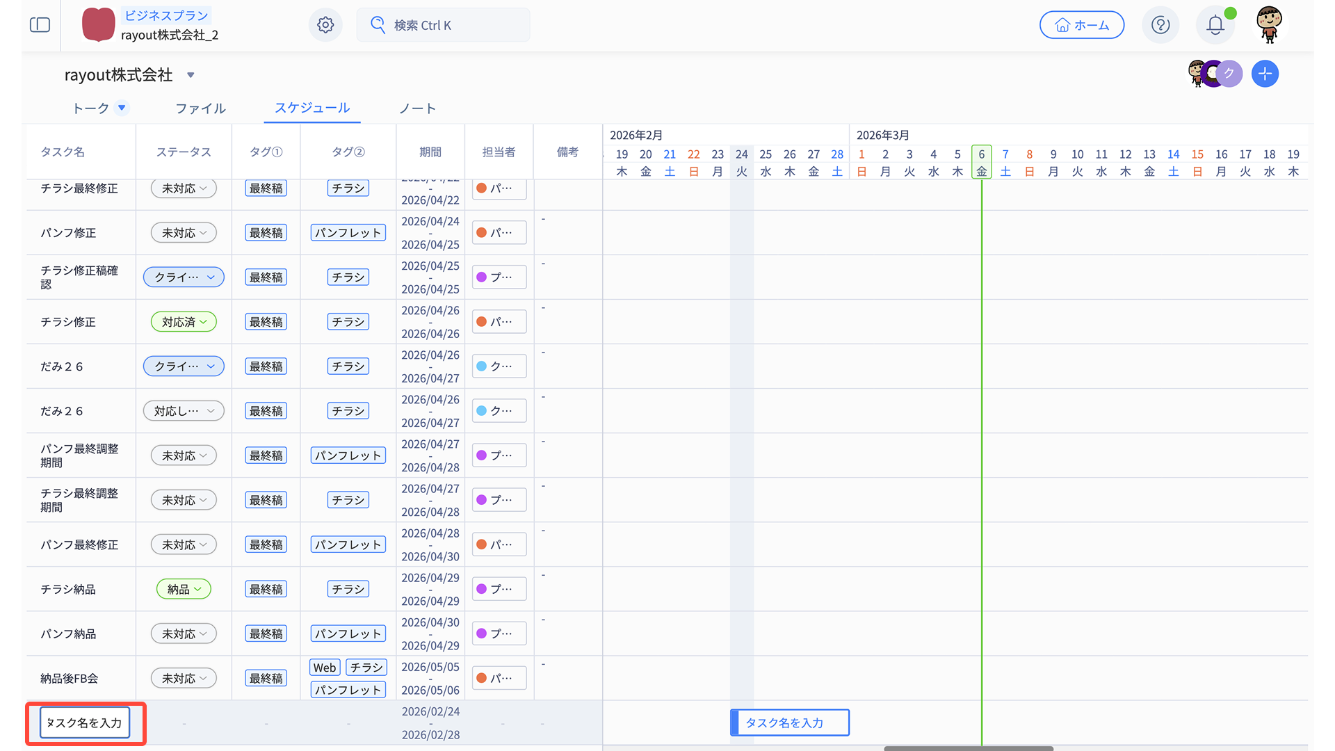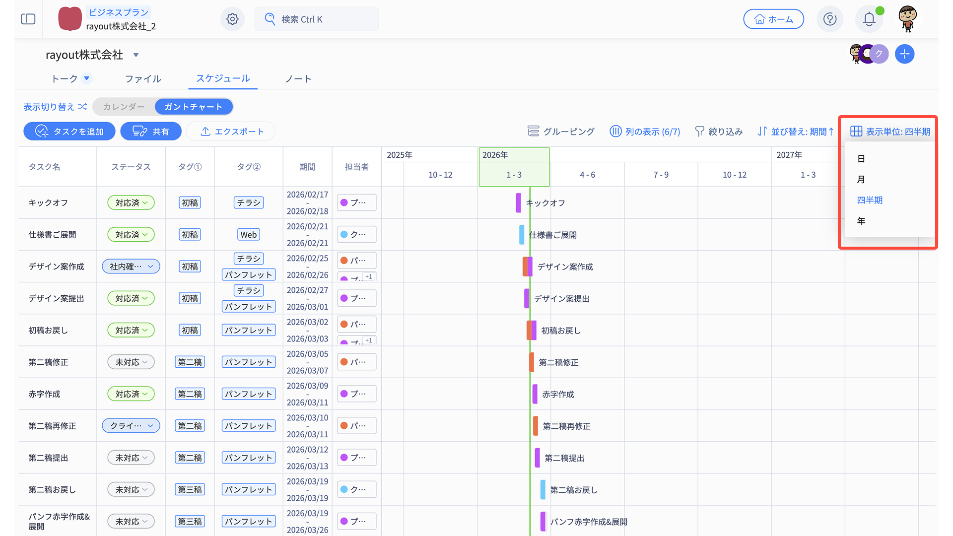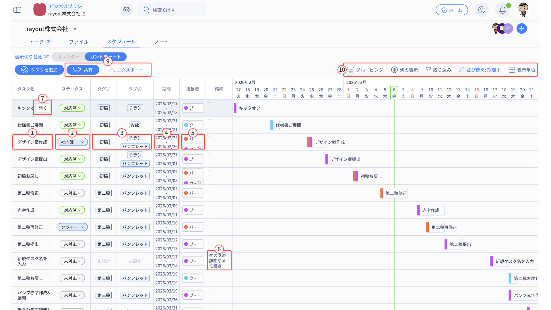 「タスク名・ステータス・タグ・期間・担当者・備考」の情報がそのまま反映されます。