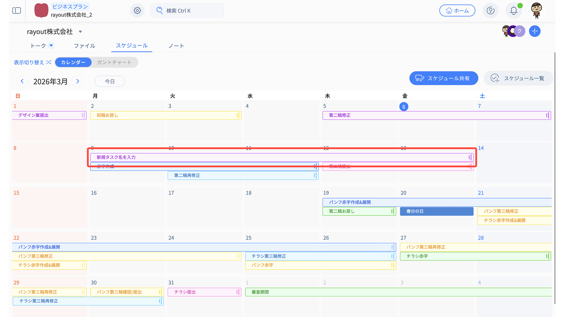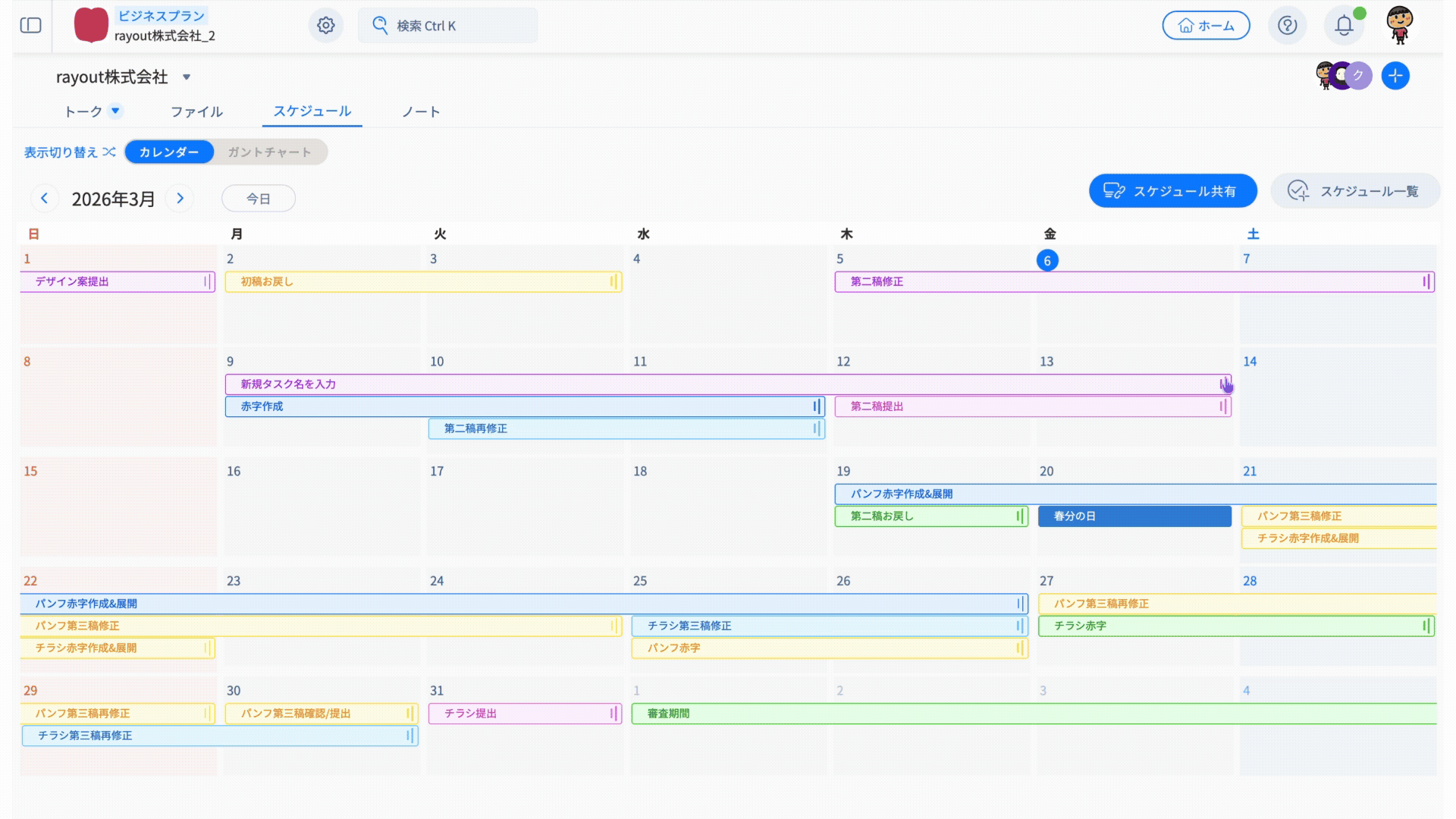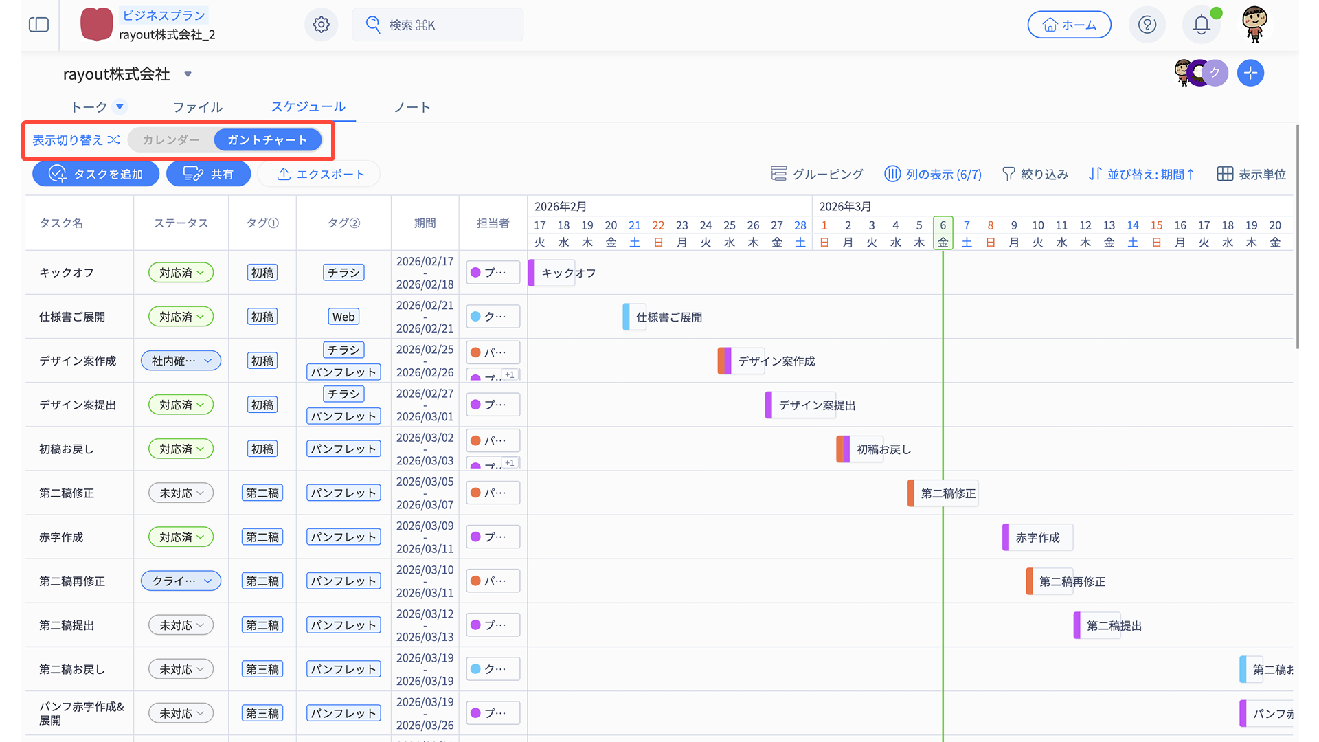 スケジュールタブには、「カレンダービュー」と「ガントチャートビュー」の2種類があります。