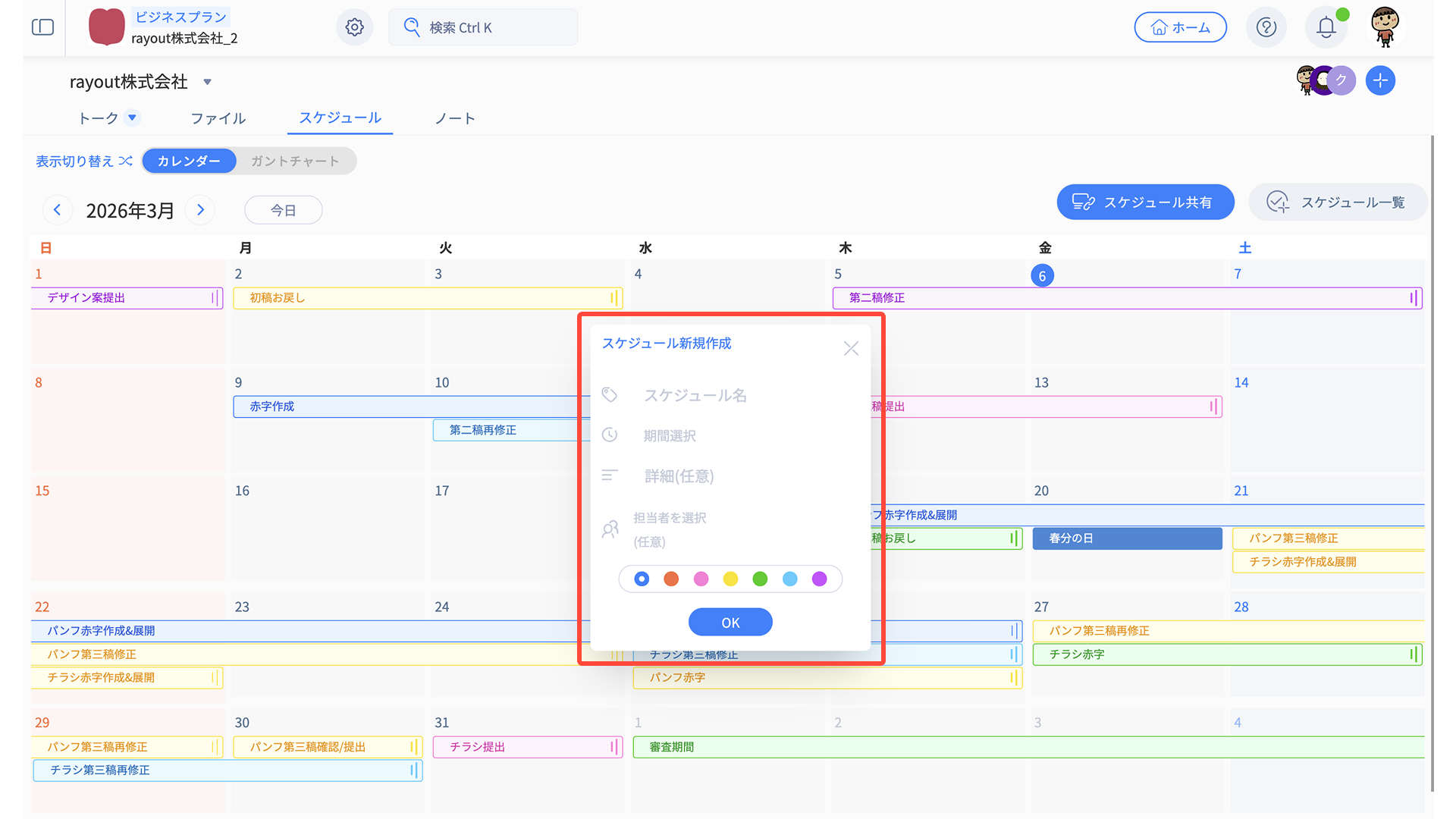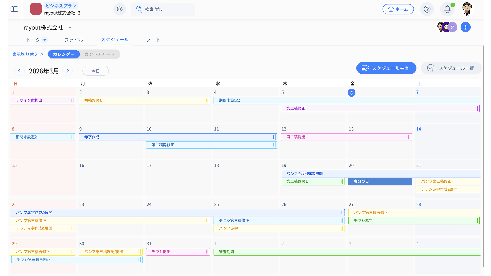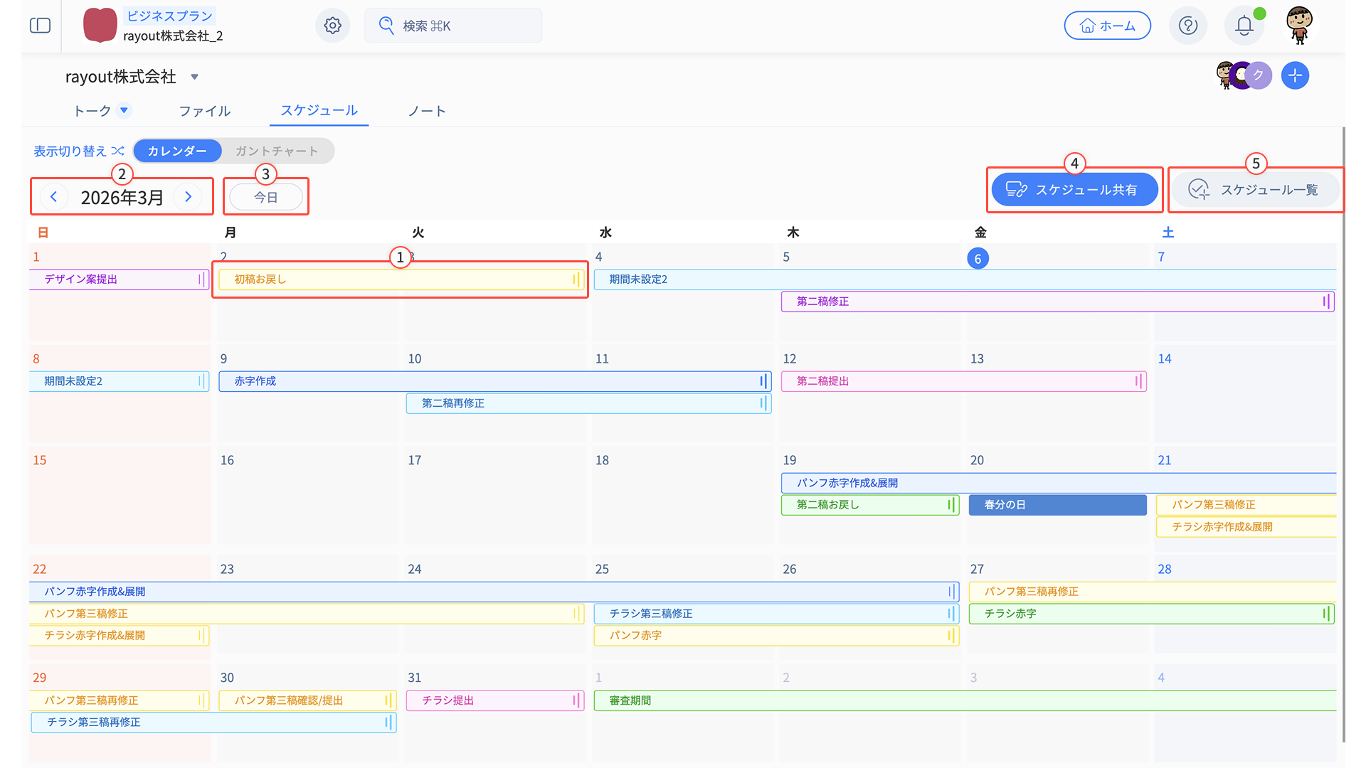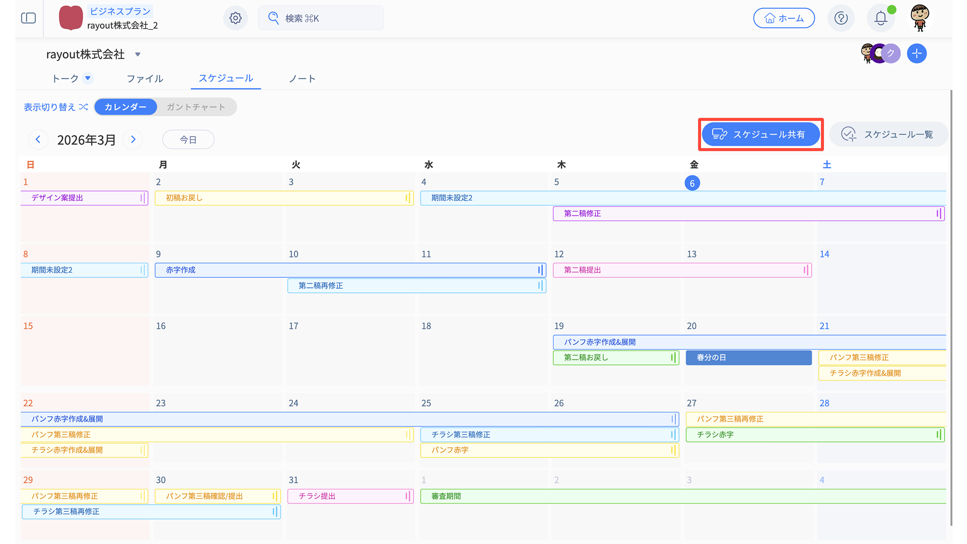 スケジュールタブには、「カレンダービュー」と「ガントチャートビュー」の2種類があります。