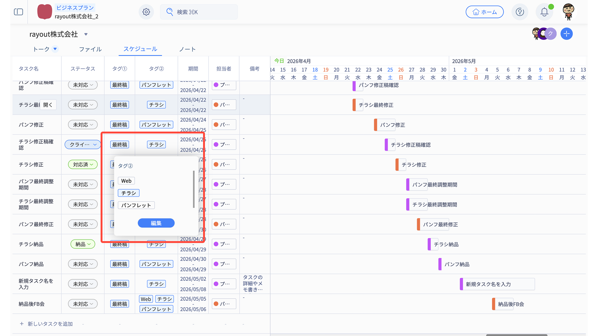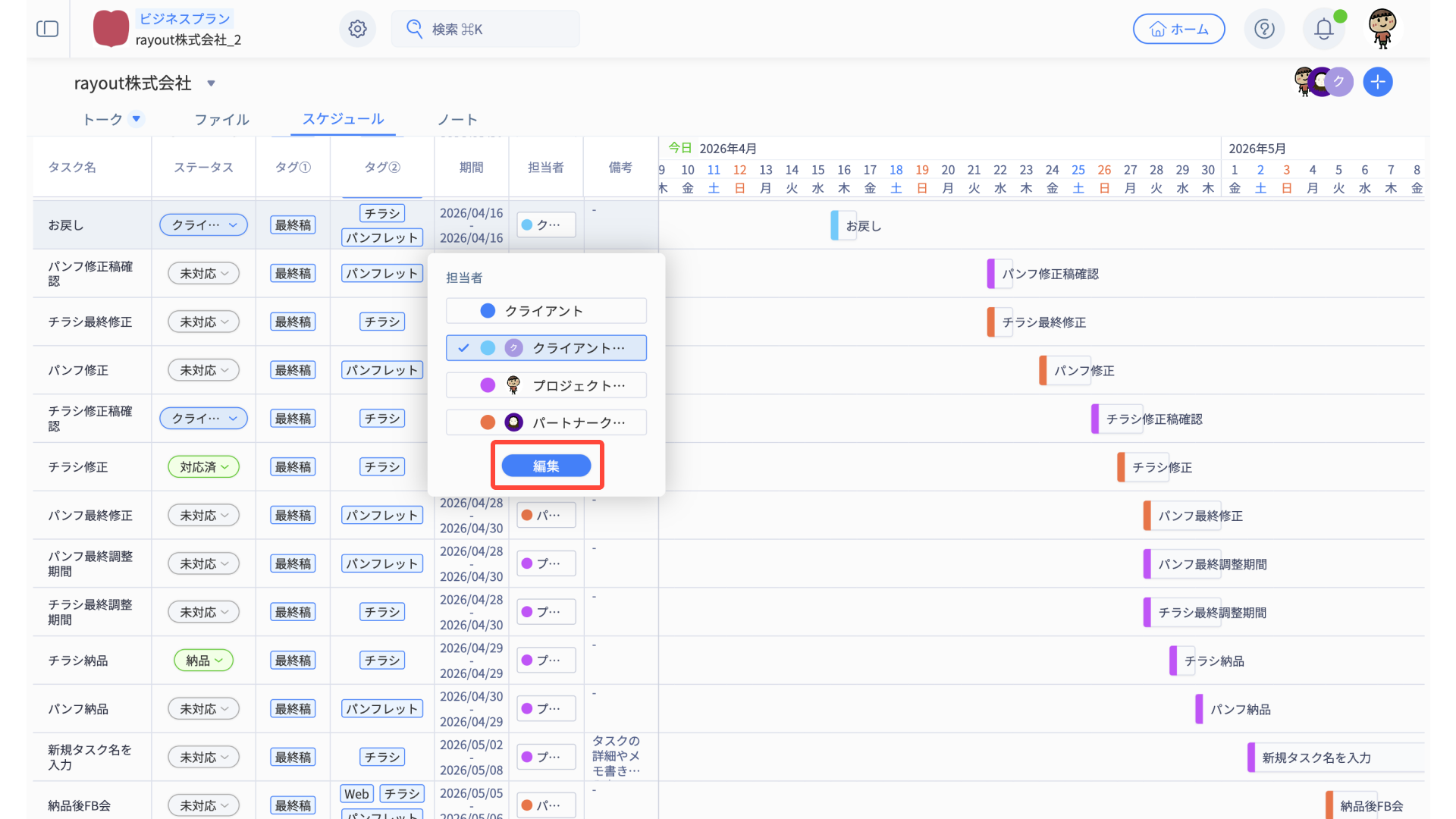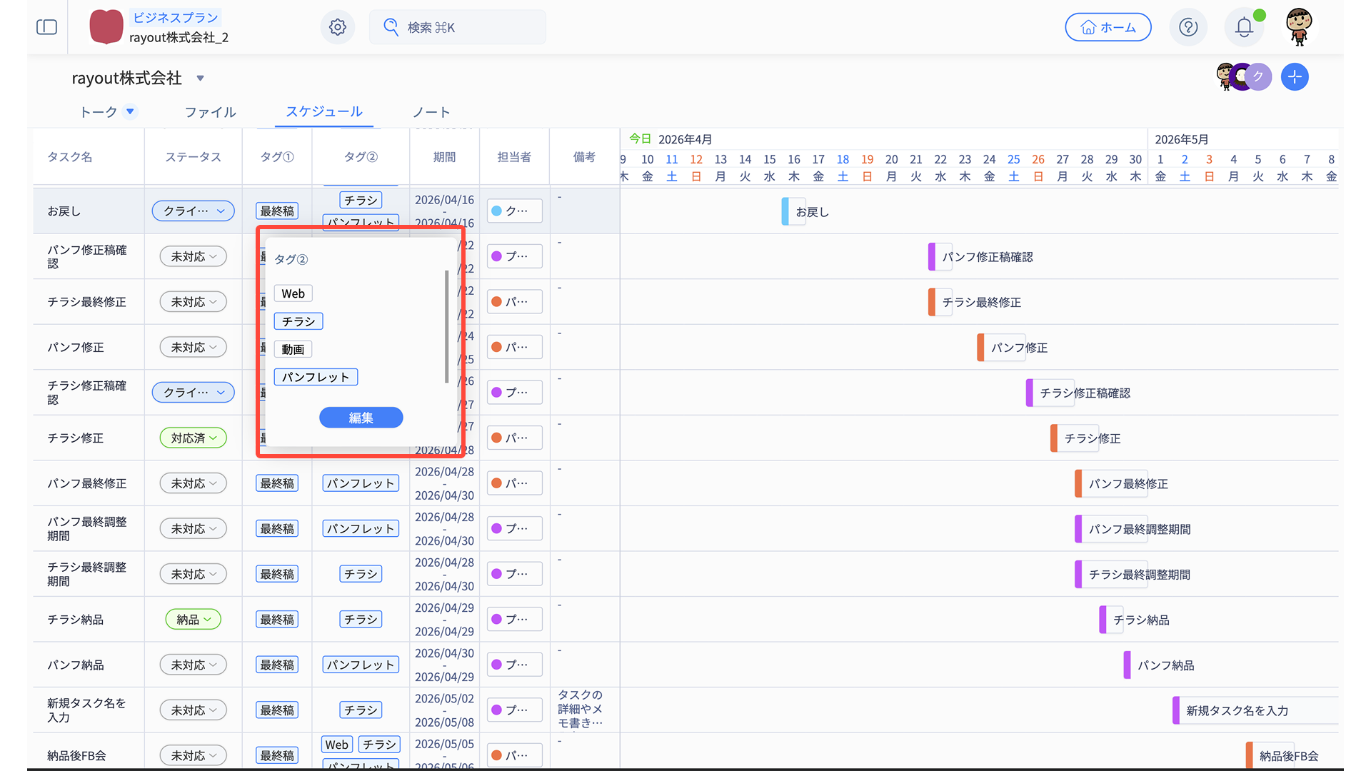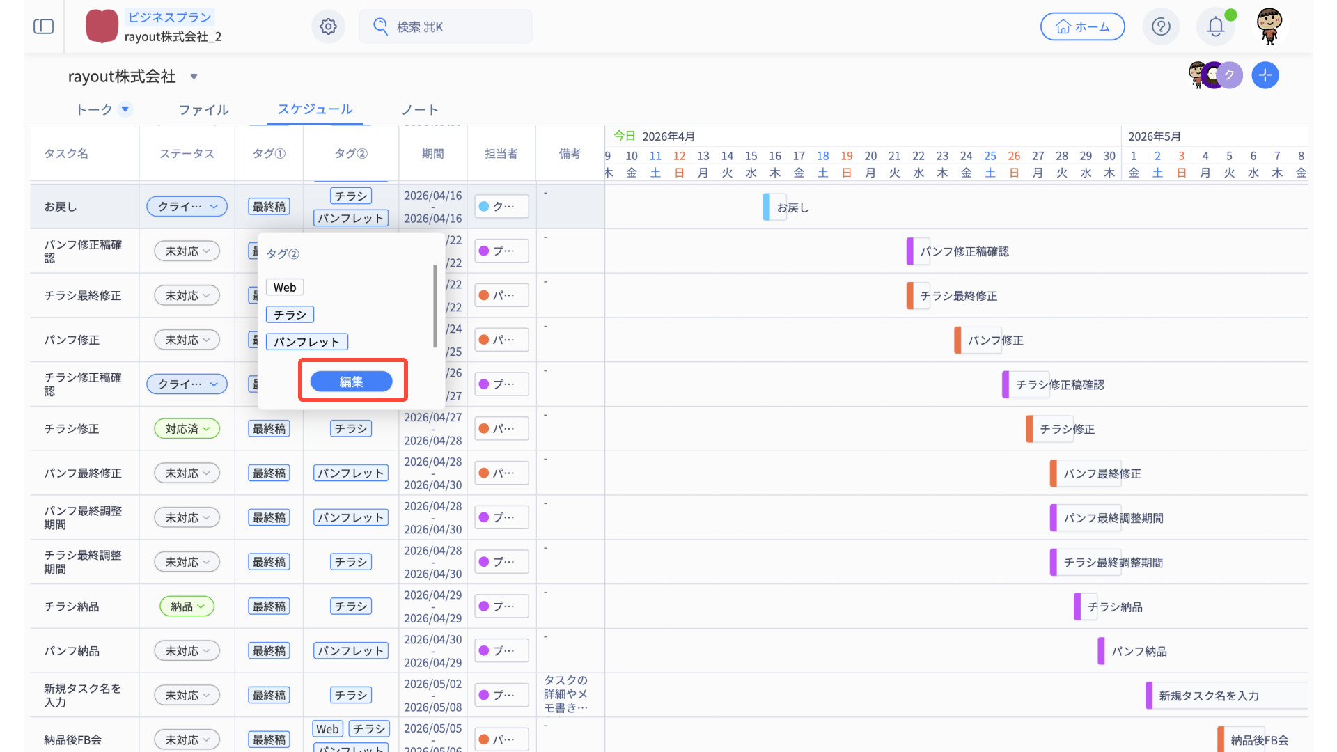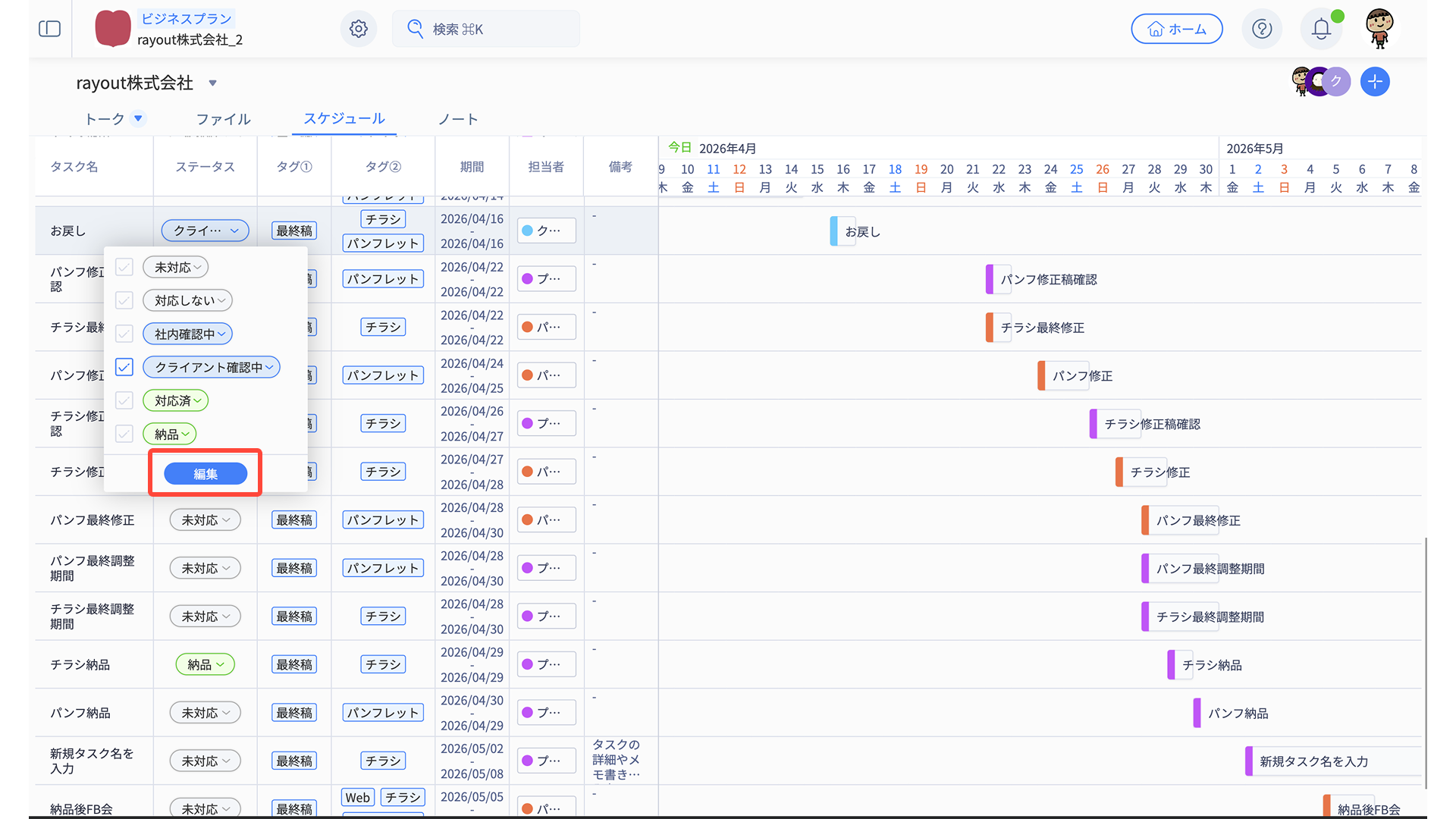 - スケジュール編集メニューから、適宜タスク内容を編集