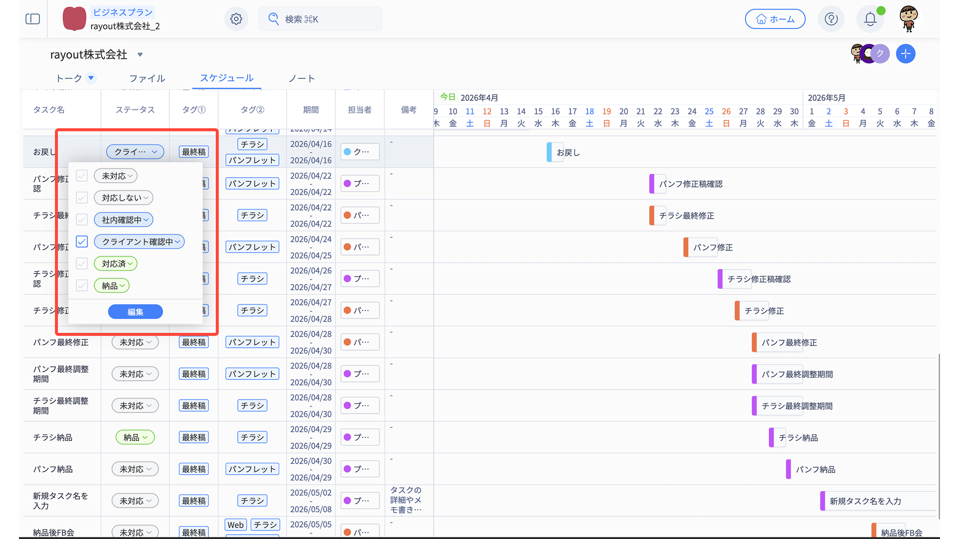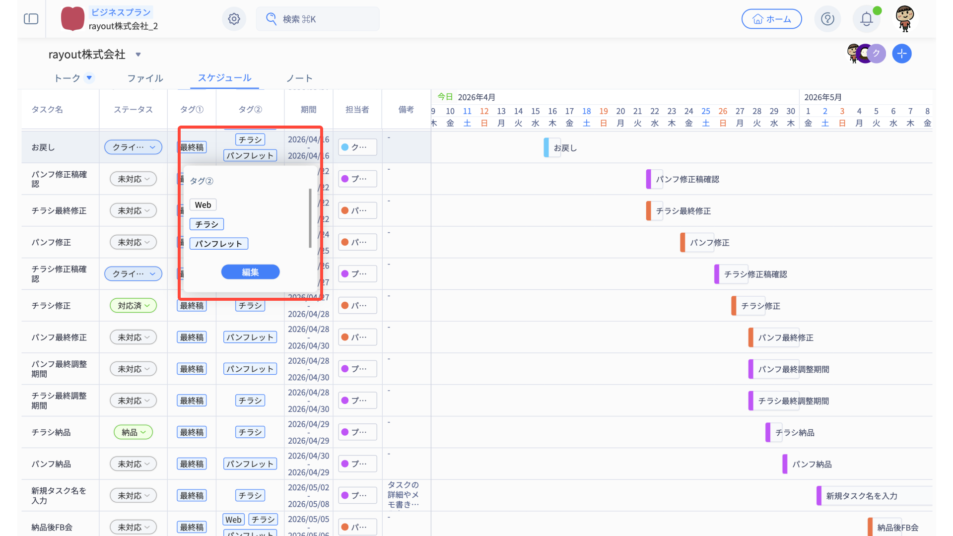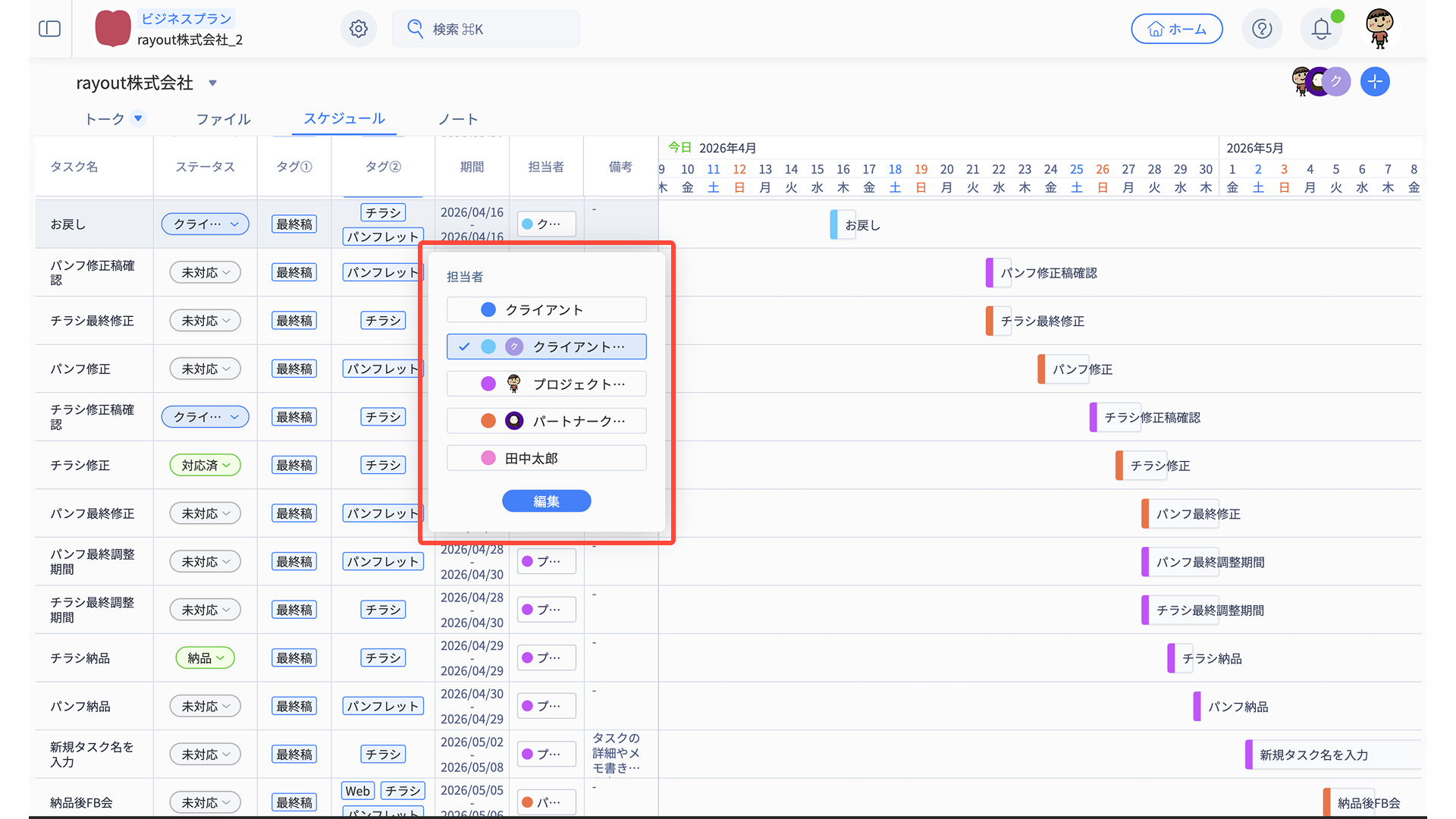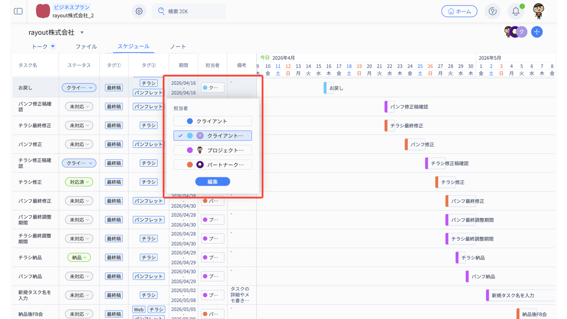 - スケジュール編集メニューから、適宜タスク内容を編集