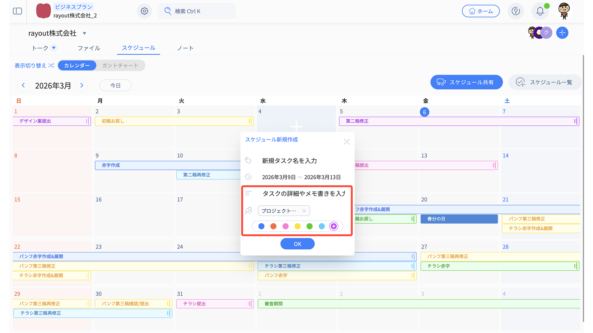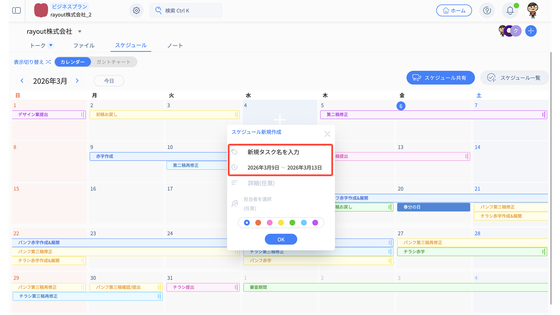 - カレンダーでの既存タスクの色変更時に、ガントチャートで表示される色