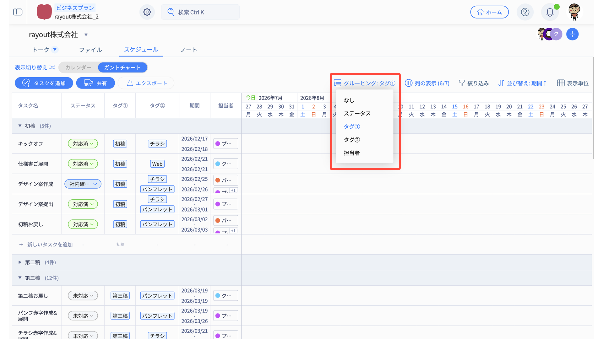 タスクを担当者別・タグ別などでまとめて表示できます。