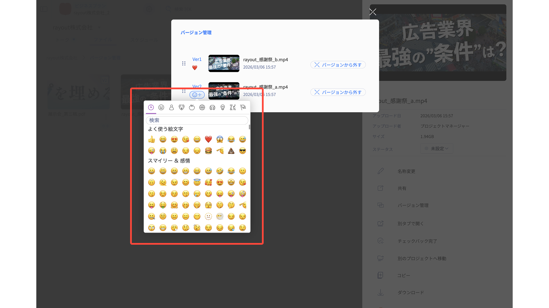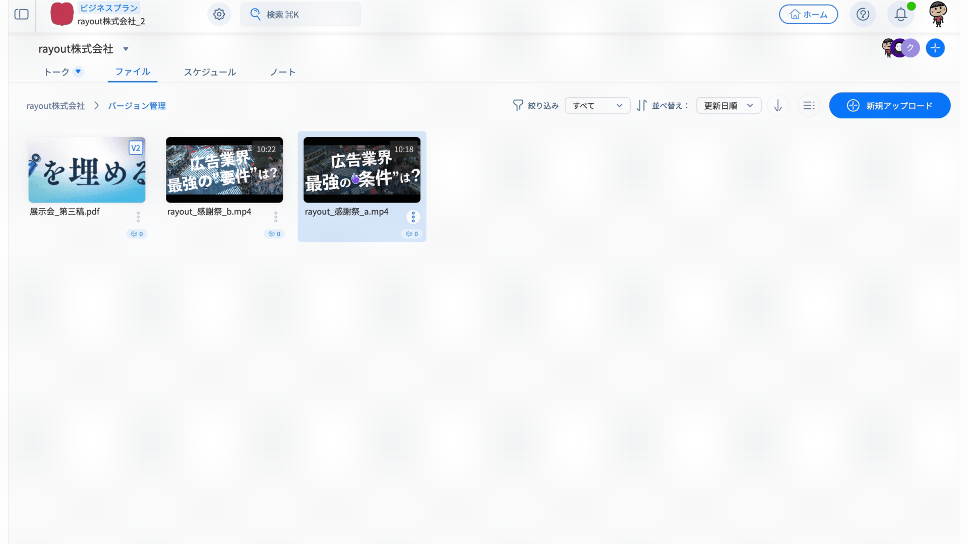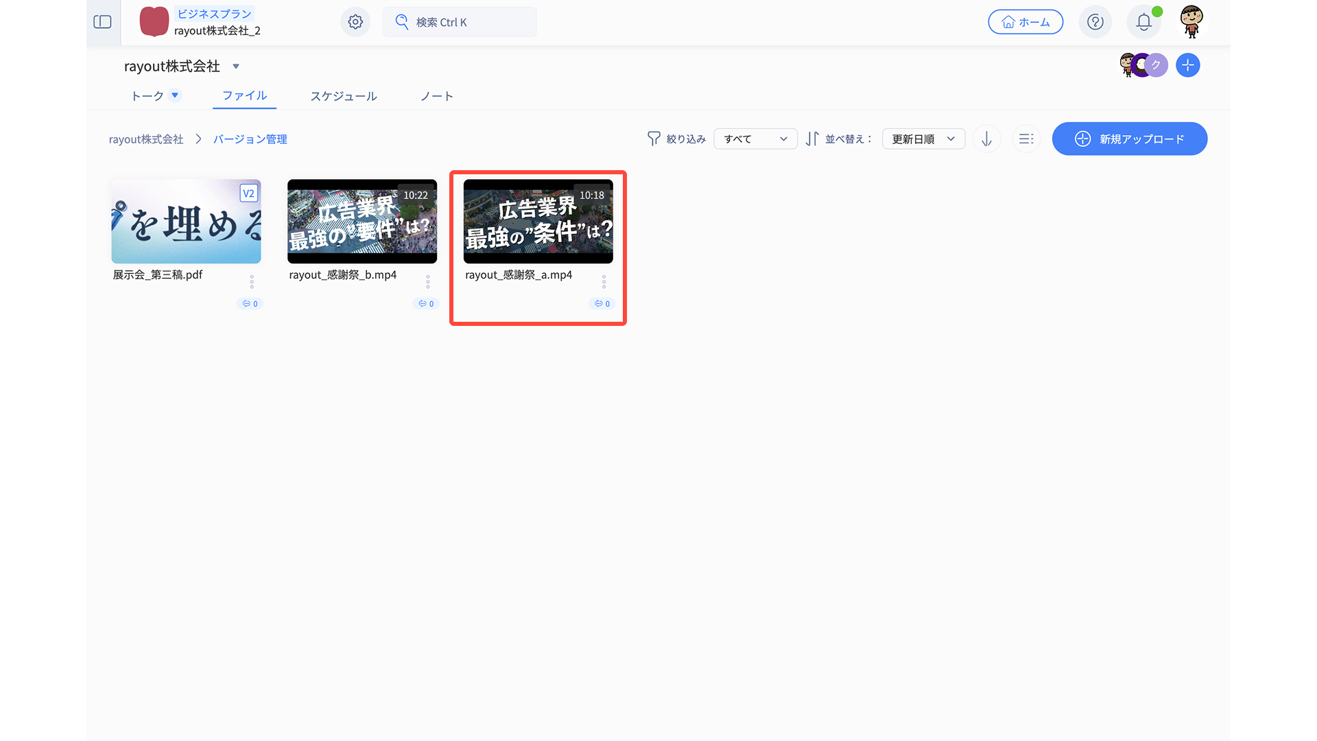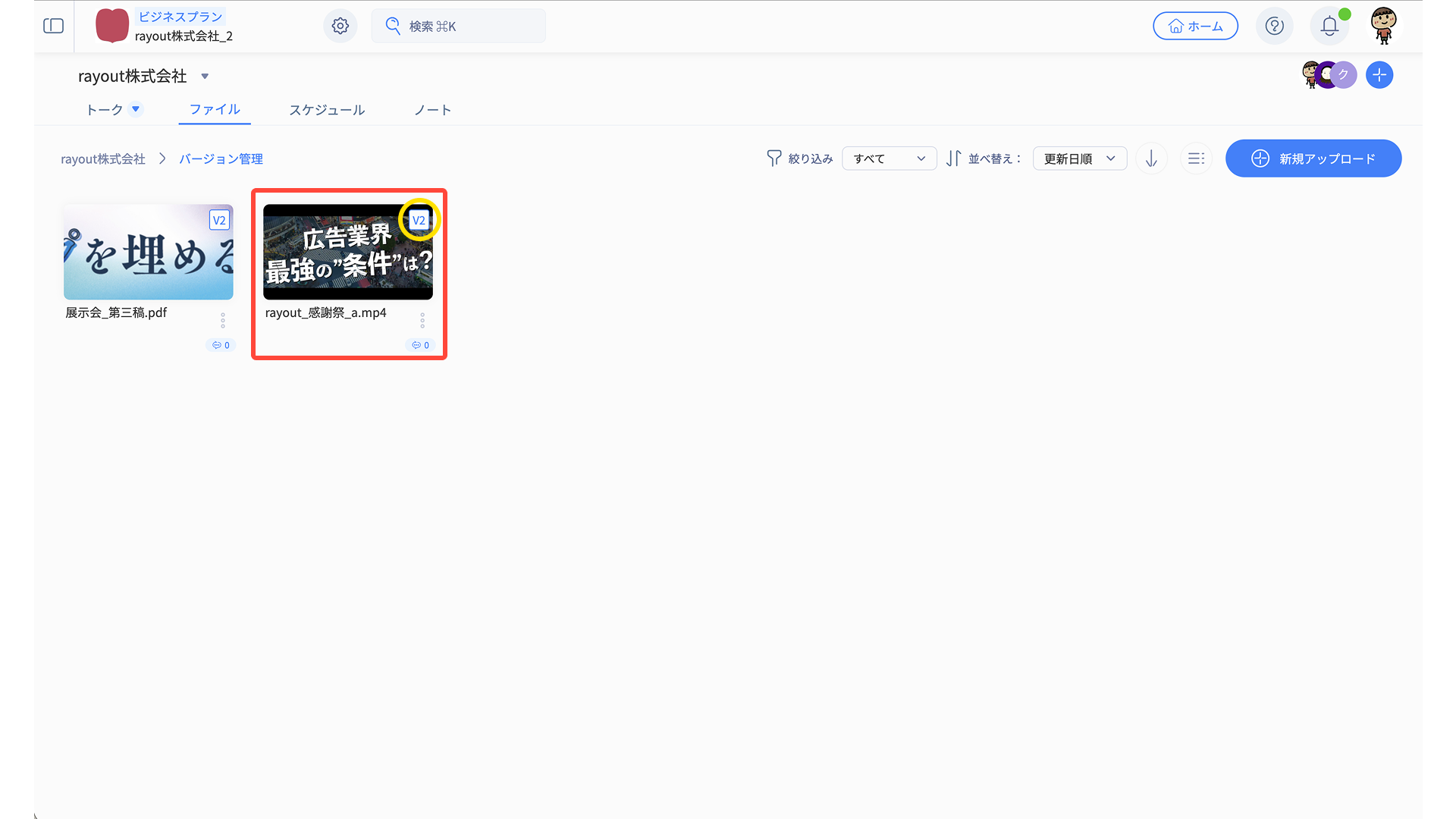 バージョンにしたファイルには、サムネイルに「V2」と表示されます