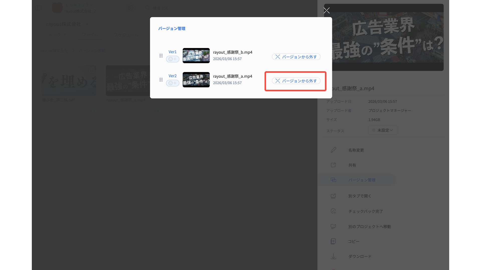 - 外したいファイルの右下「バージョンから外す」を押し、解除完了