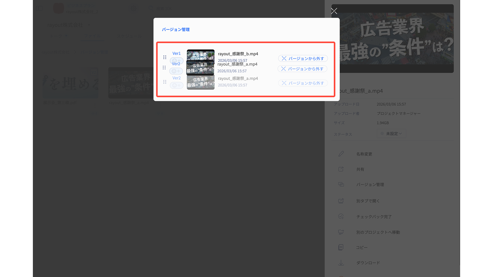 それぞれを独立したファイルとして扱うのではなく、1つの制作物の「バージョン」として整理できます。