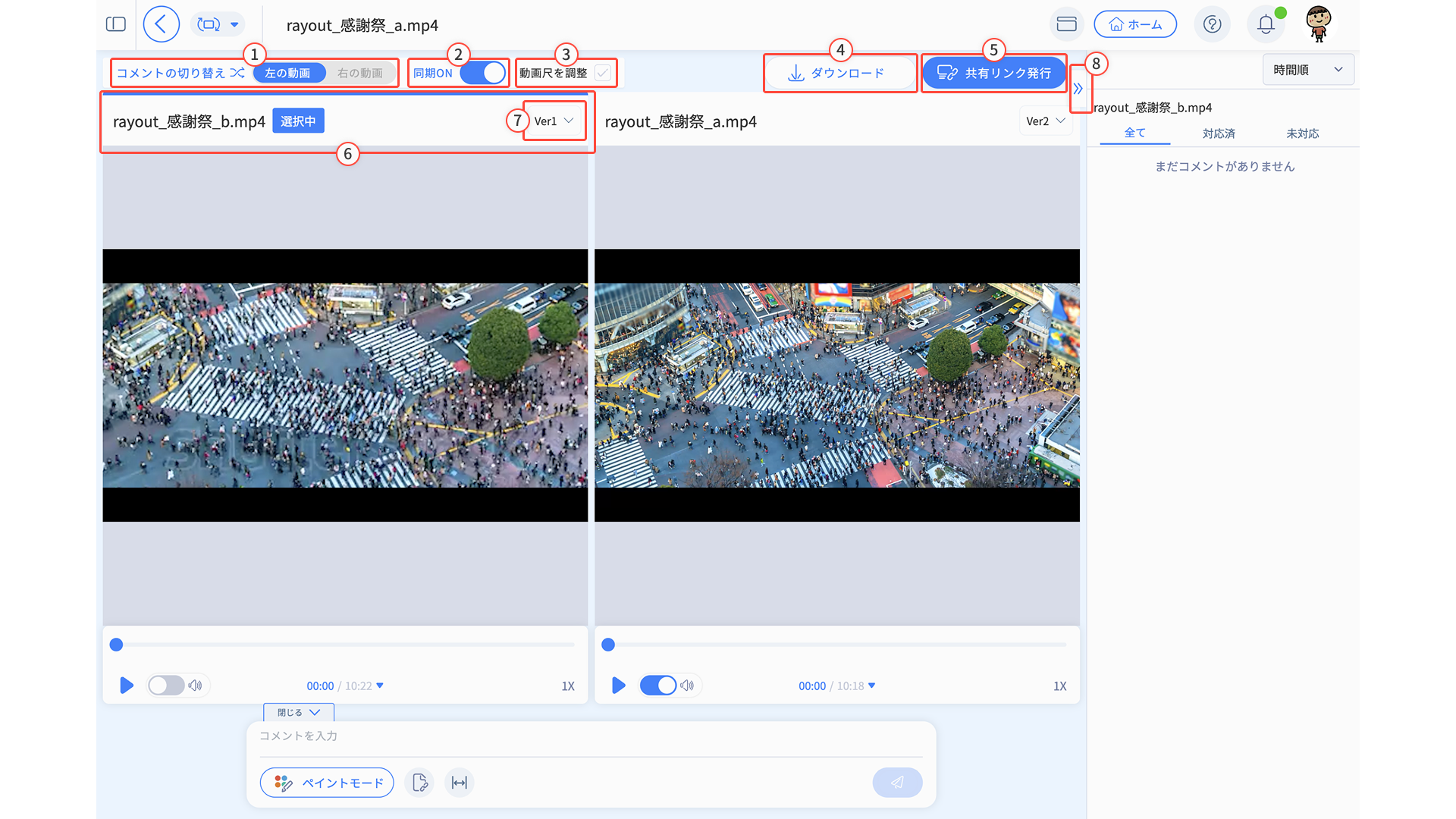 見比べ画面では、2つの制作物を左右に並べて表示します。