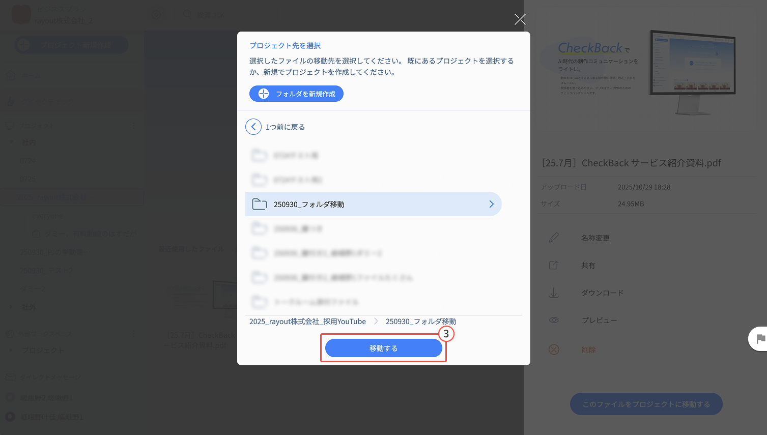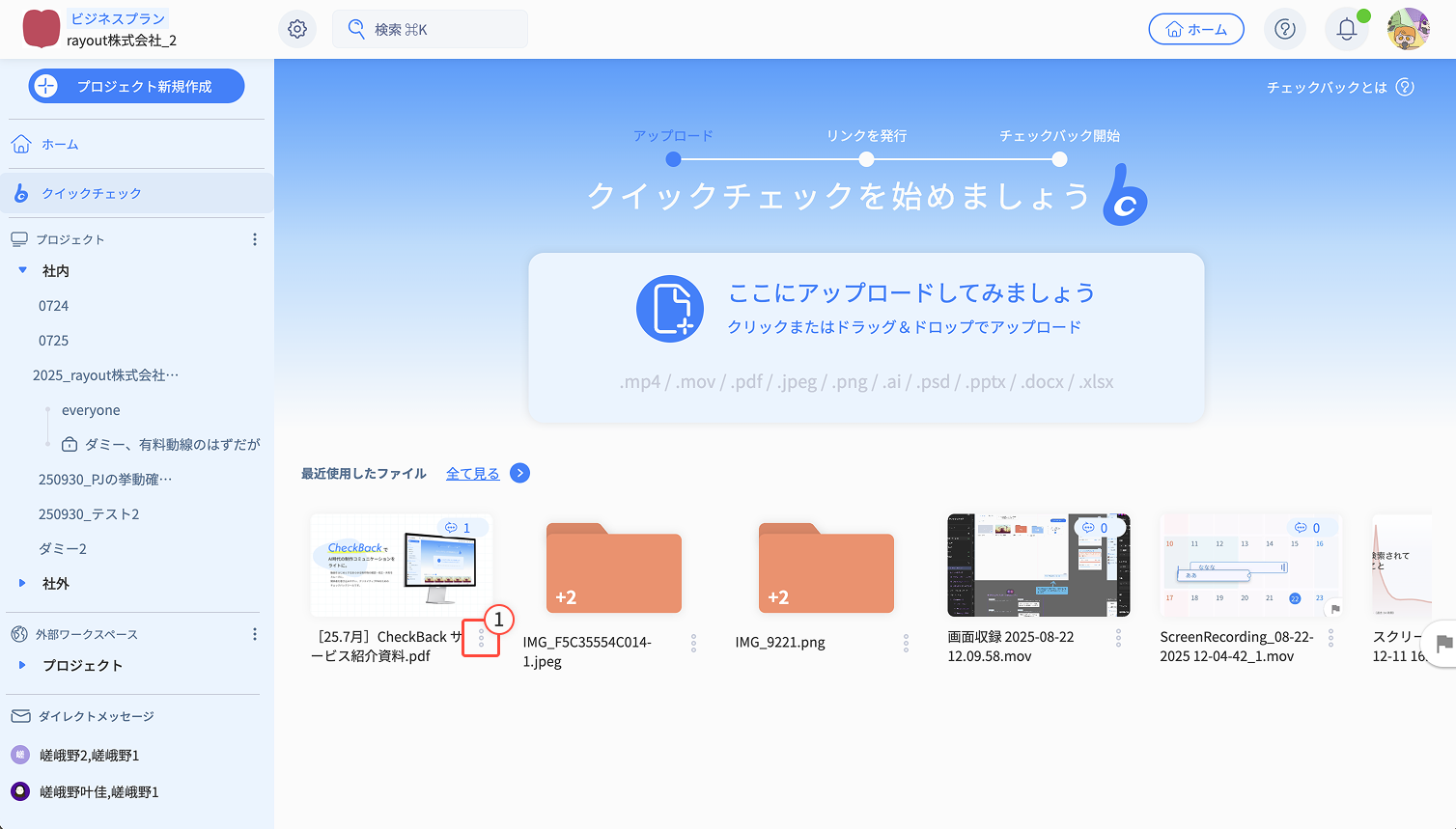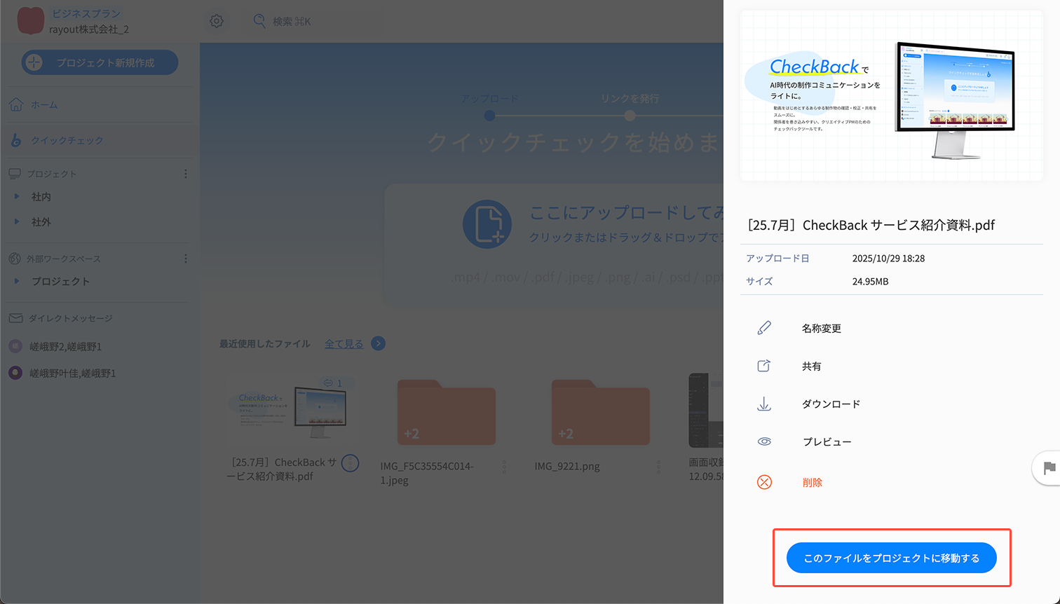 クイックチェックにアップロードしたファイルは、任意のプロジェクトに移動させることもできます。
