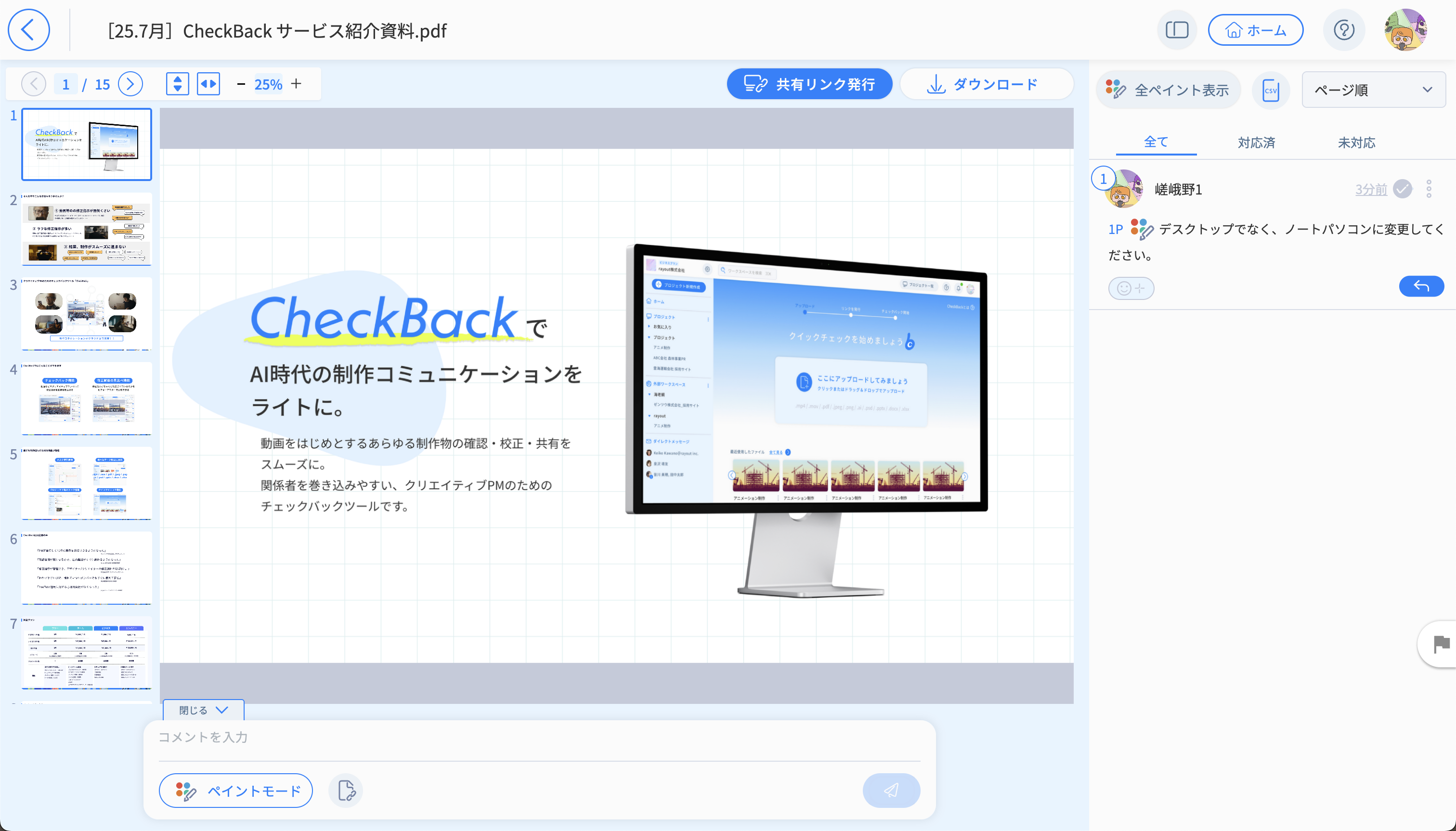- 「チェックバックする」からチェックバック画面に移動し、レビューコメントを入力して共有することも可能です。