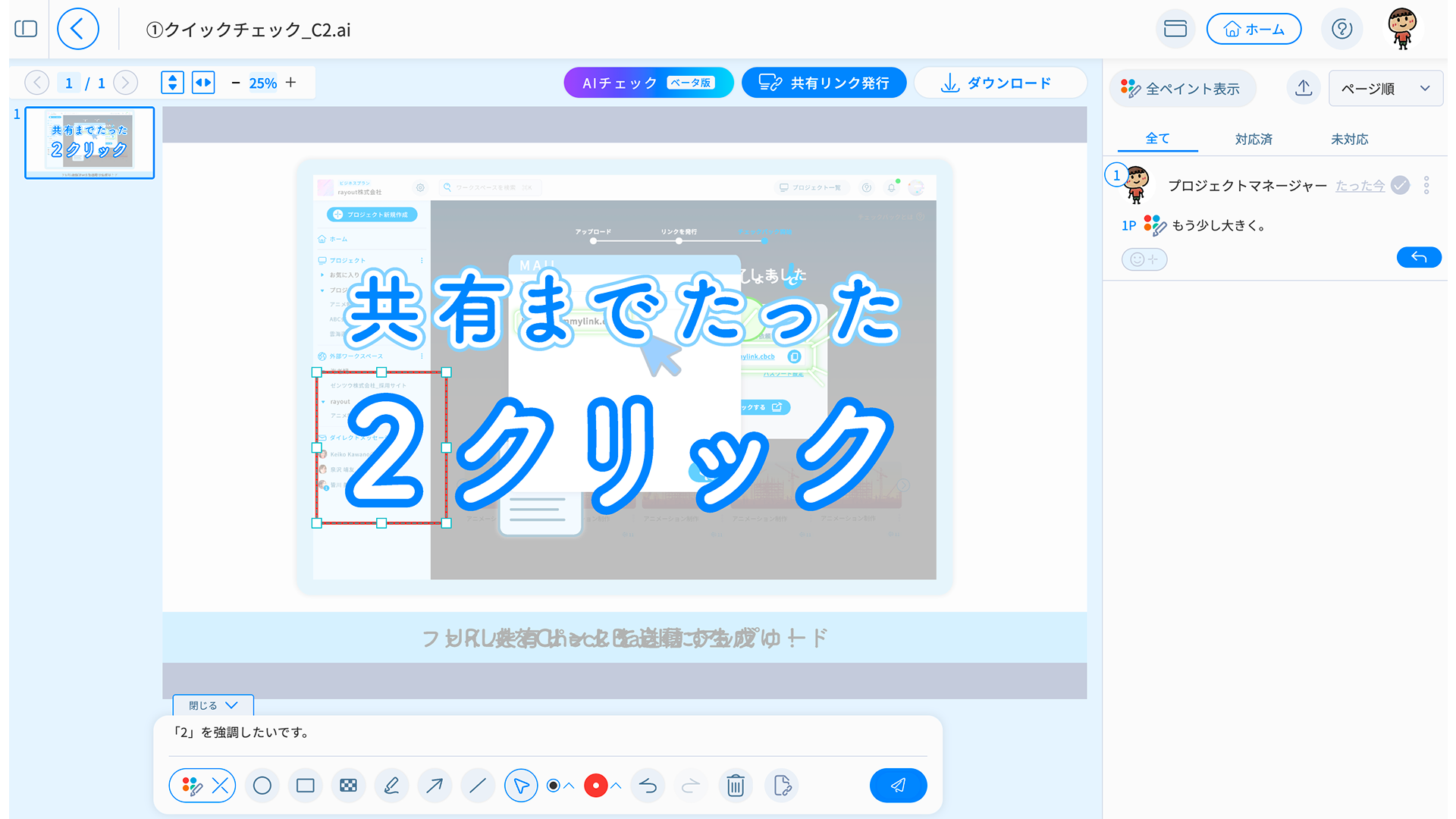 チェックバック画面にもワンクリックでアクセスできるので、レビューコメントを入力してからの共有ができ、よりスピーディーな対応が求められる際に重宝されます。