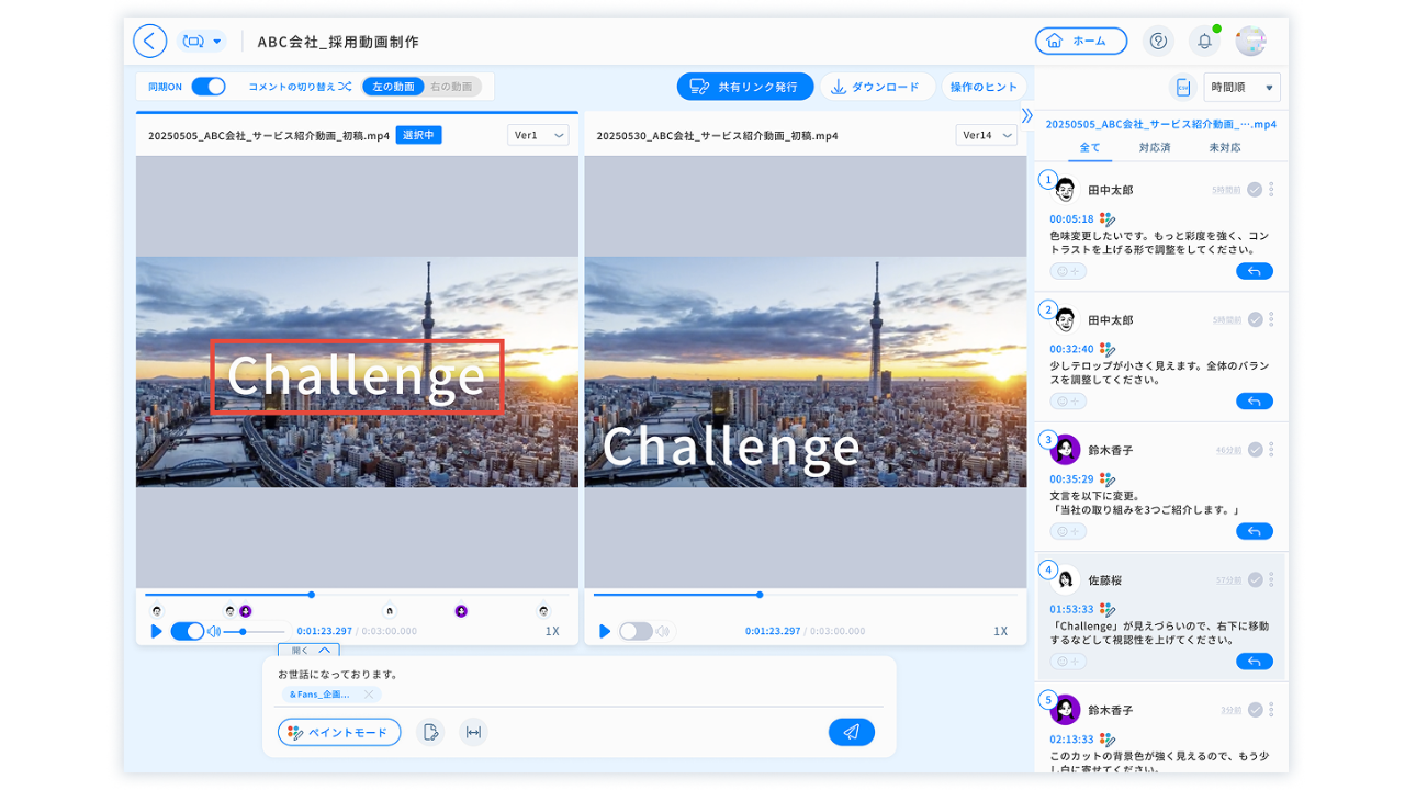 バージョンを入れ替えたい場合は、再生エリア上のタブから「VerX」をクリックして、見比べたいバージョンを選択してください。 - デフォルトでは、1つ前のバージョンのコメントが表示されています。
