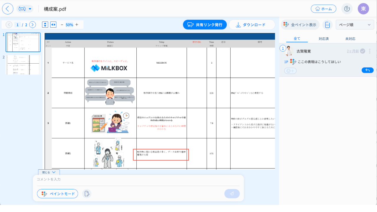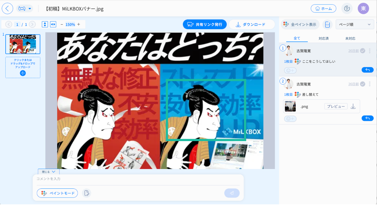 コメントにファイルを添付できるため、イメージ共有や素材提供がよりスムーズになります。