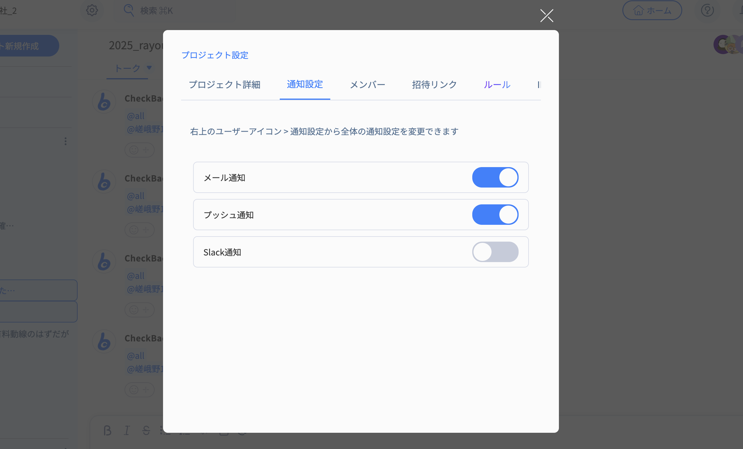 プロジェクトの名称・メンバー・通知などの詳細設定を行えます。