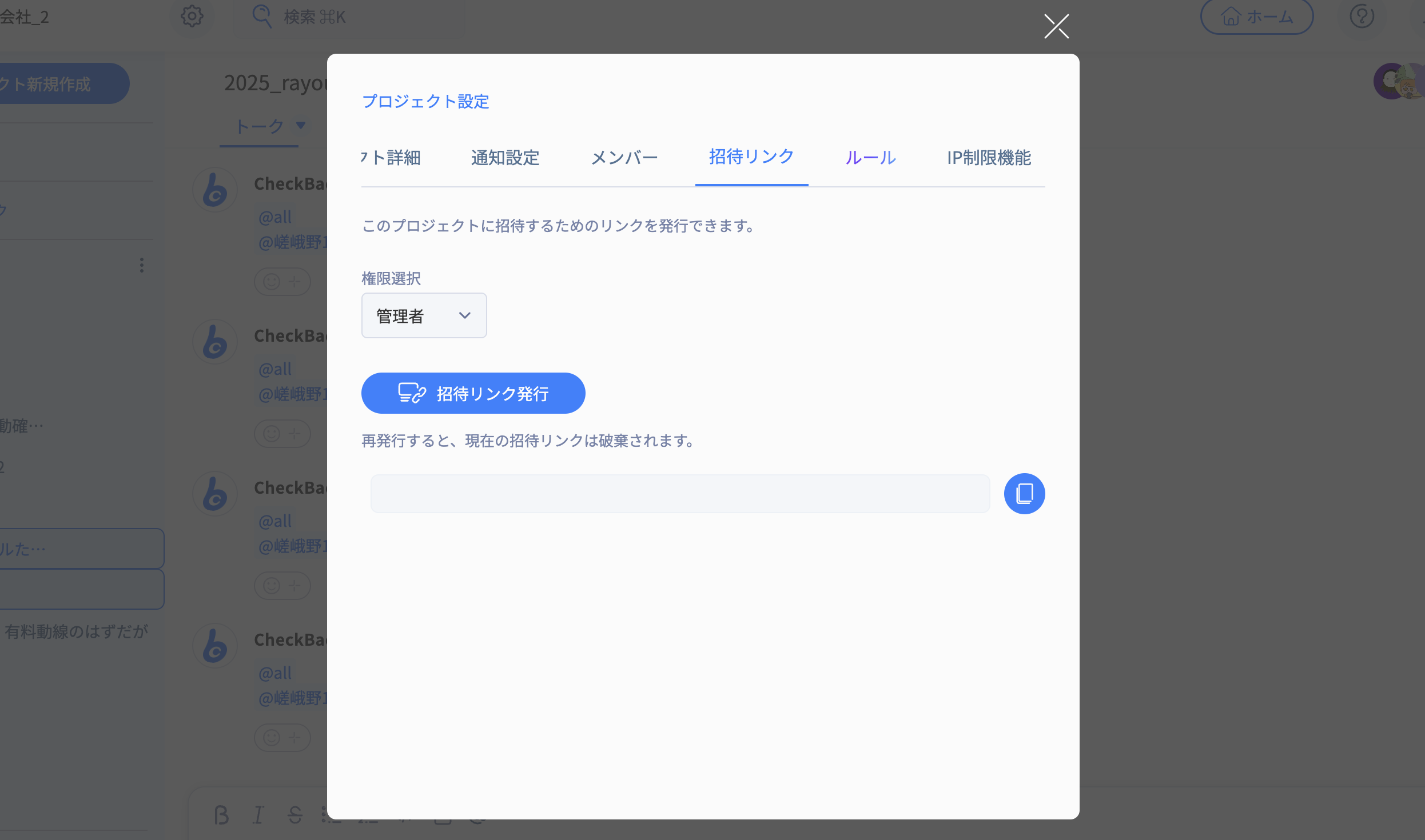- 「招待リンク発行」をクリックし、リンクをコピーして共有