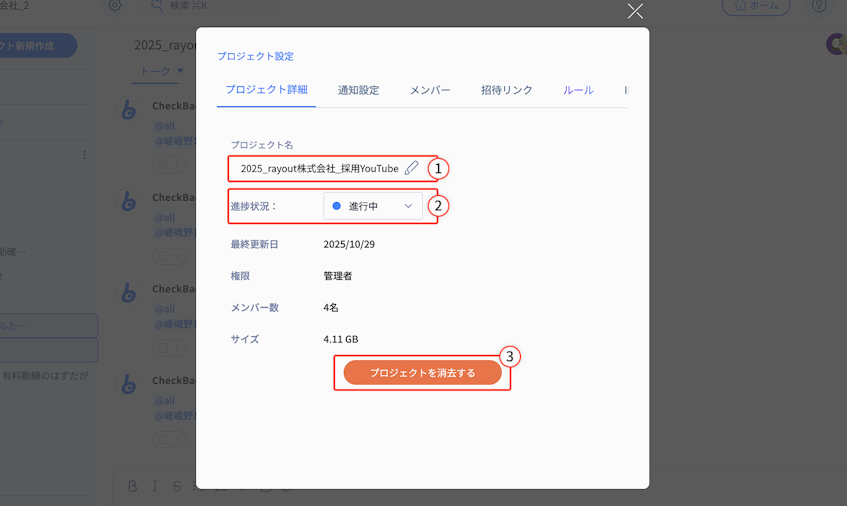 削除:プロジェクト自体を削除(プロジェクトオーナーのみ実行可能)