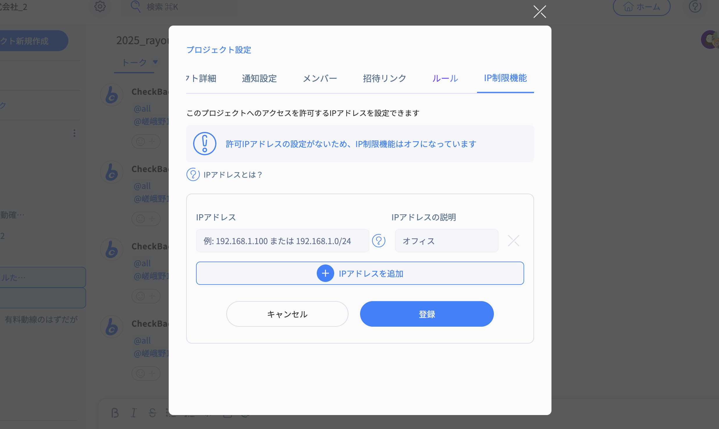- 登録者のグローバルIPは自動取得され、説明文を添えて追加可能です。