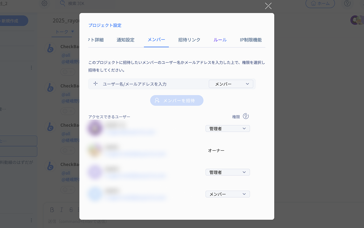 プロジェクトメンバーの管理・招待・削除を行えます。