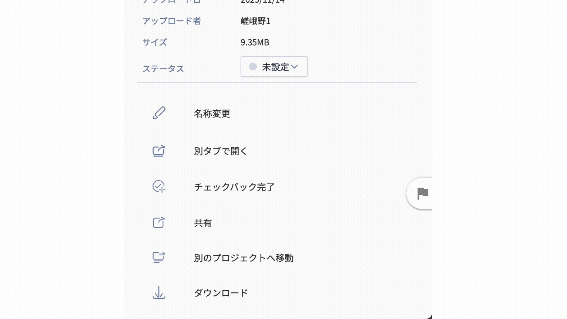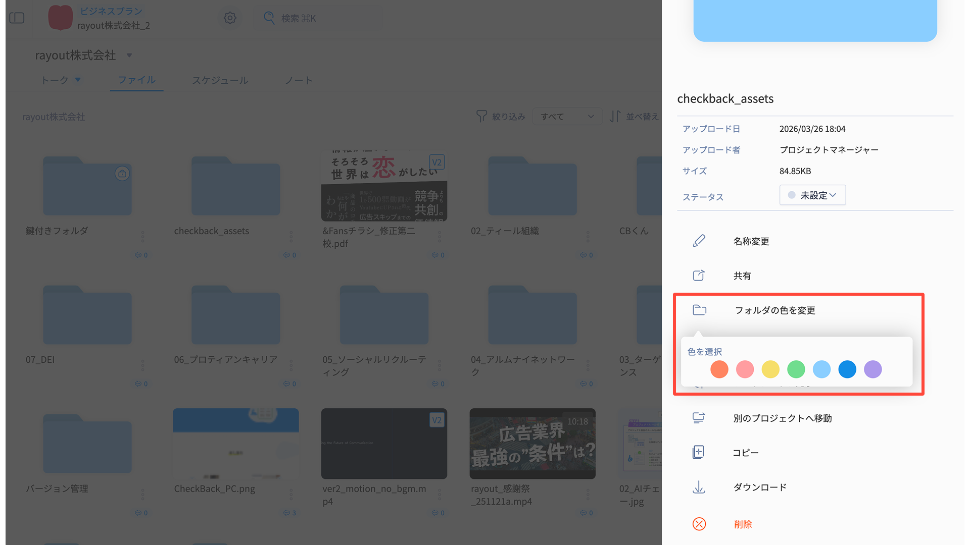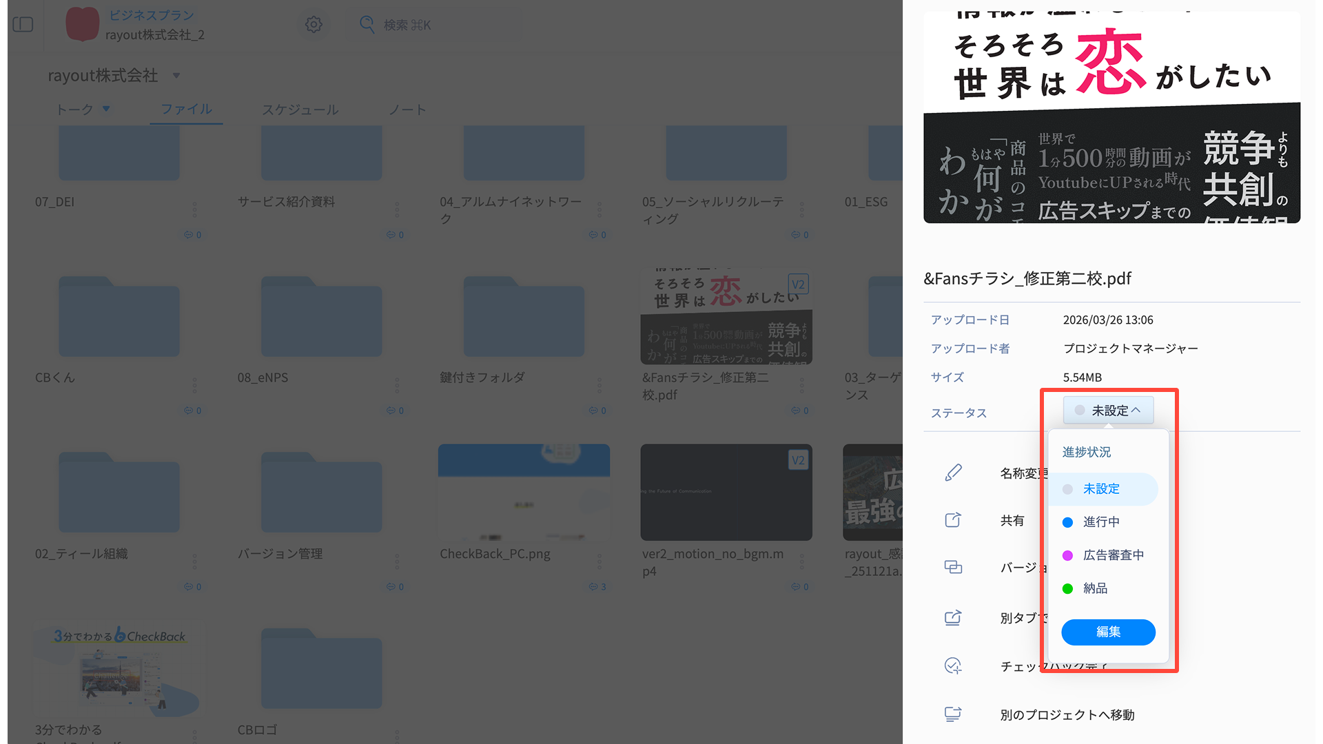 チェックバック作業や確認まわりの進捗に応じてファイルのステータスを設定することで、プロジェクト内の制作物の“今、どれが誰のボールか”を可視化できます。