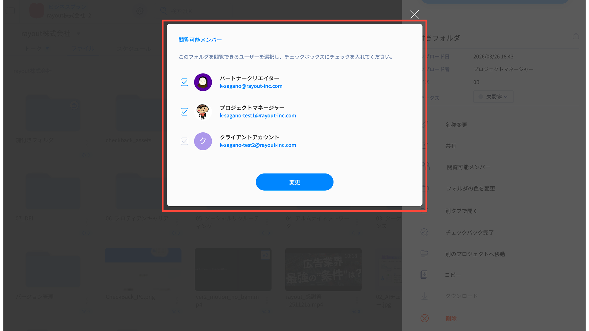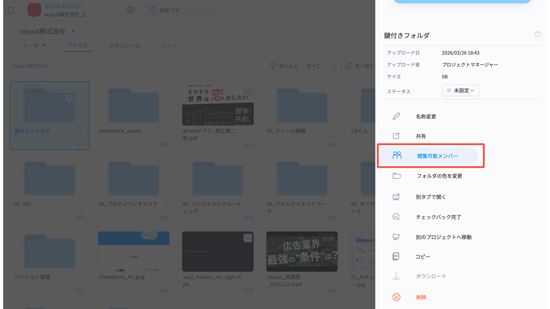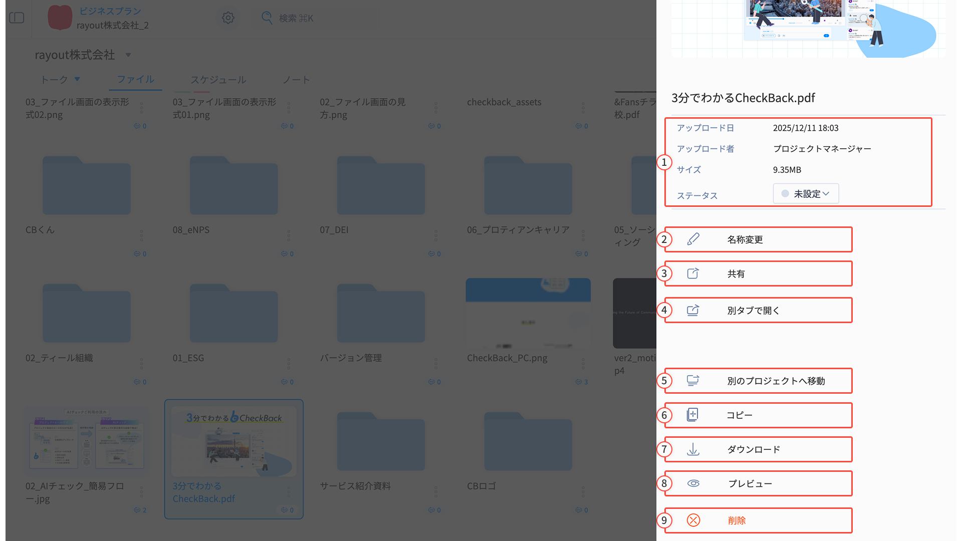 チェックバック作業や確認まわりの進捗に応じてファイルのステータスを設定することで、プロジェクト内の制作物の“今、どれが誰のボールか”を可視化できます。