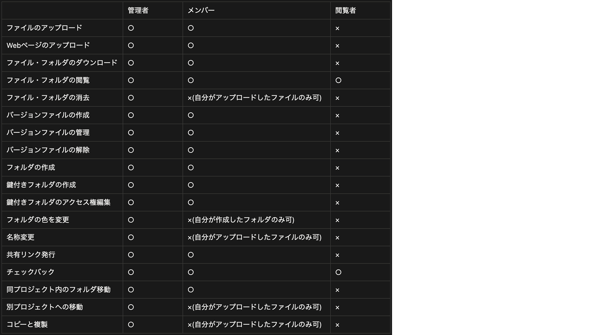 各ユーザーの権限に応じて、ファイル機能で実行可能な操作に制限があります。