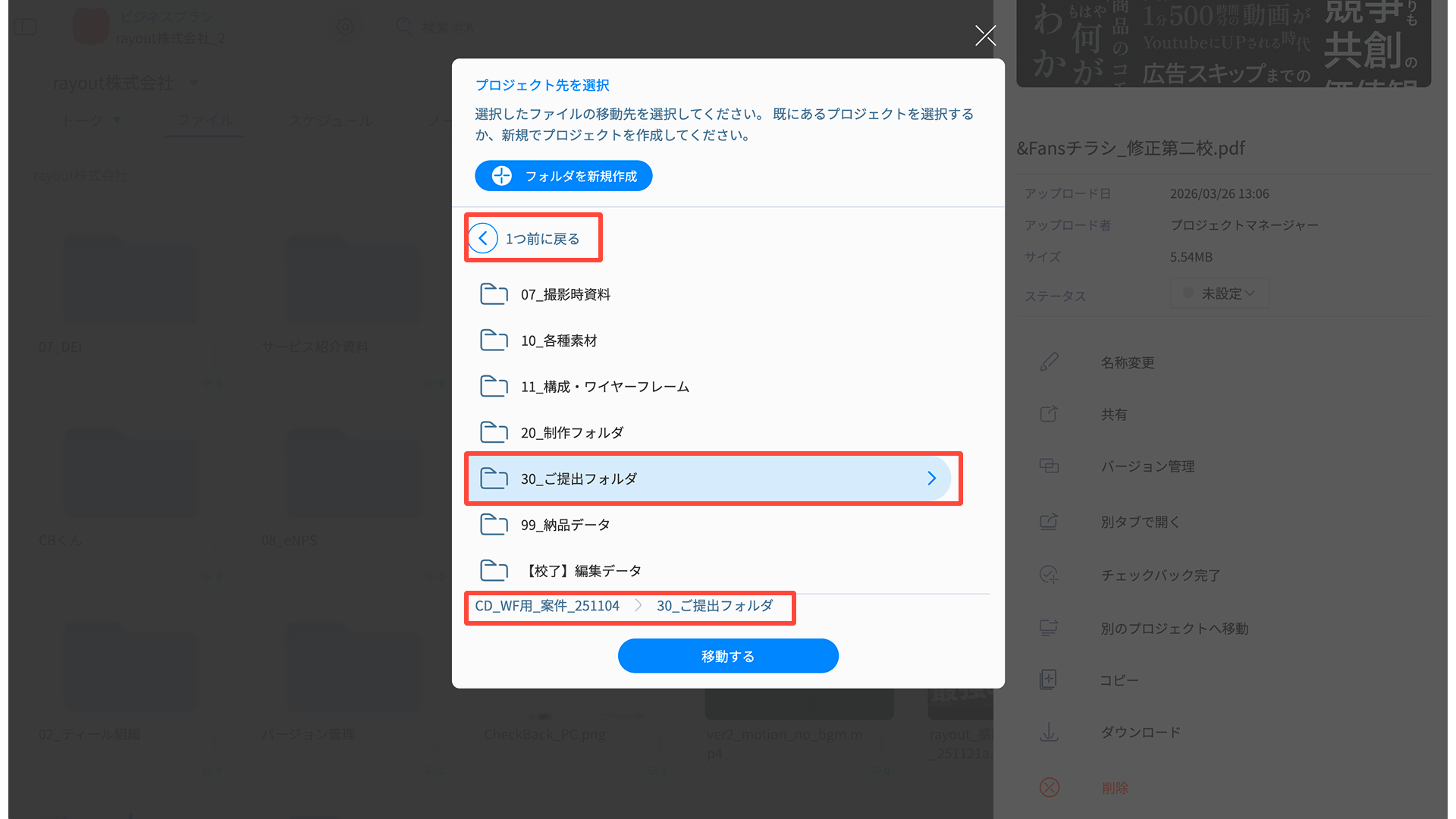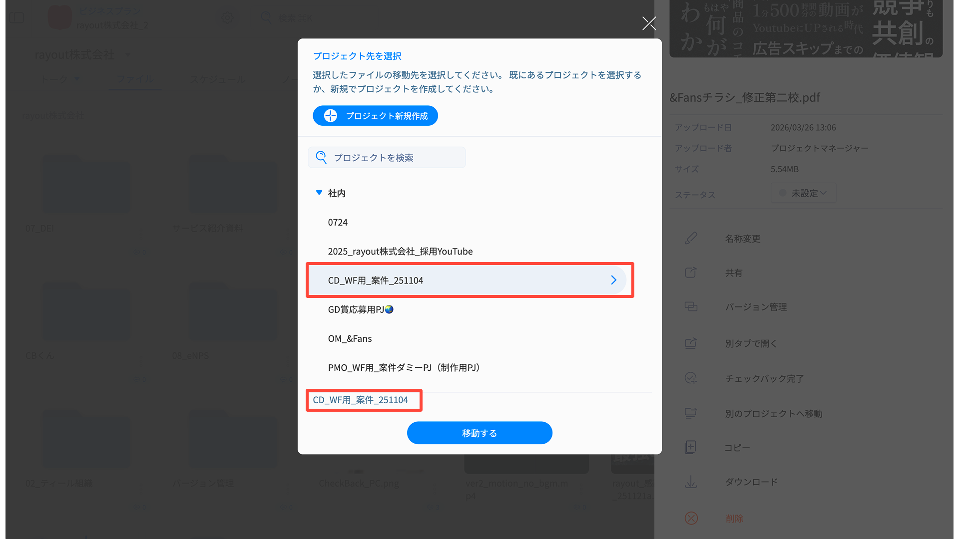 また、新しいプロジェクトや新しいフォルダを作成したうえで移動することも可能です。