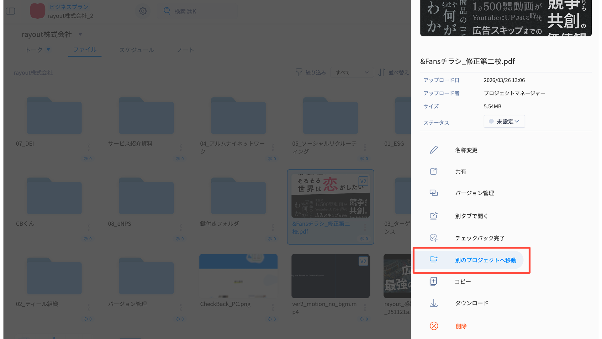 案件の切り替えや、誤って別のプロジェクトへ格納したファイルの整理、既存データの再活用などに便利です。