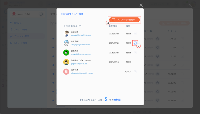 - プロジェクトメンバーを削除したい場合は、該当メンバーのチェックボックスを選択します。