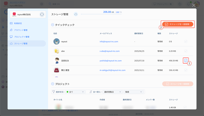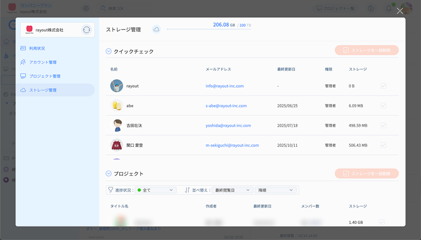 ワークスペースに参加しているメンバーのクイックチェックストレージとプロジェクトのストレージを削除可能です。