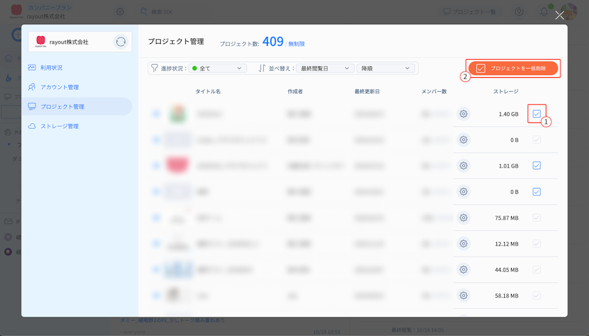 ワークスペース内の全てのプロジェクトを管理できます。複数のプロジェクトをまとめて削除したいときに便利です。
