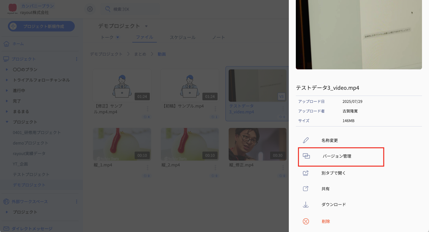 バージョンを解除したい場合は、ファイル詳細から「バージョン管理」を選択して適宜解除してください。