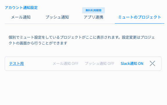 通知をOFFにしたプロジェクトは、「ミュート中のプロジェクト」一覧に表示されます。