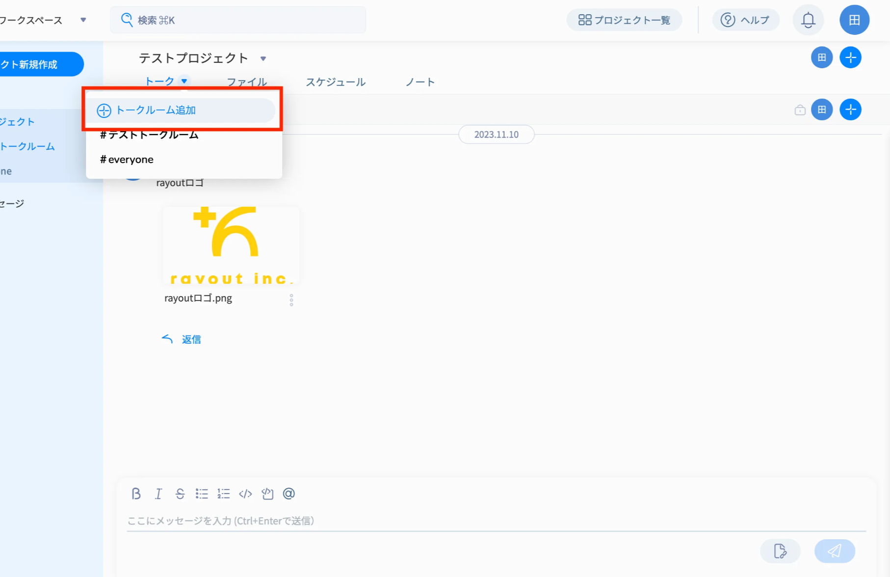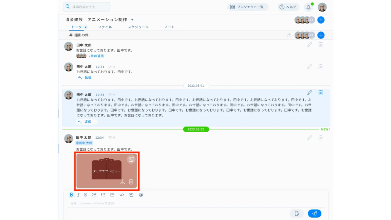 トークに添付されたファイルは、プロジェクトのファイルタブに自動で整理・保存されます。