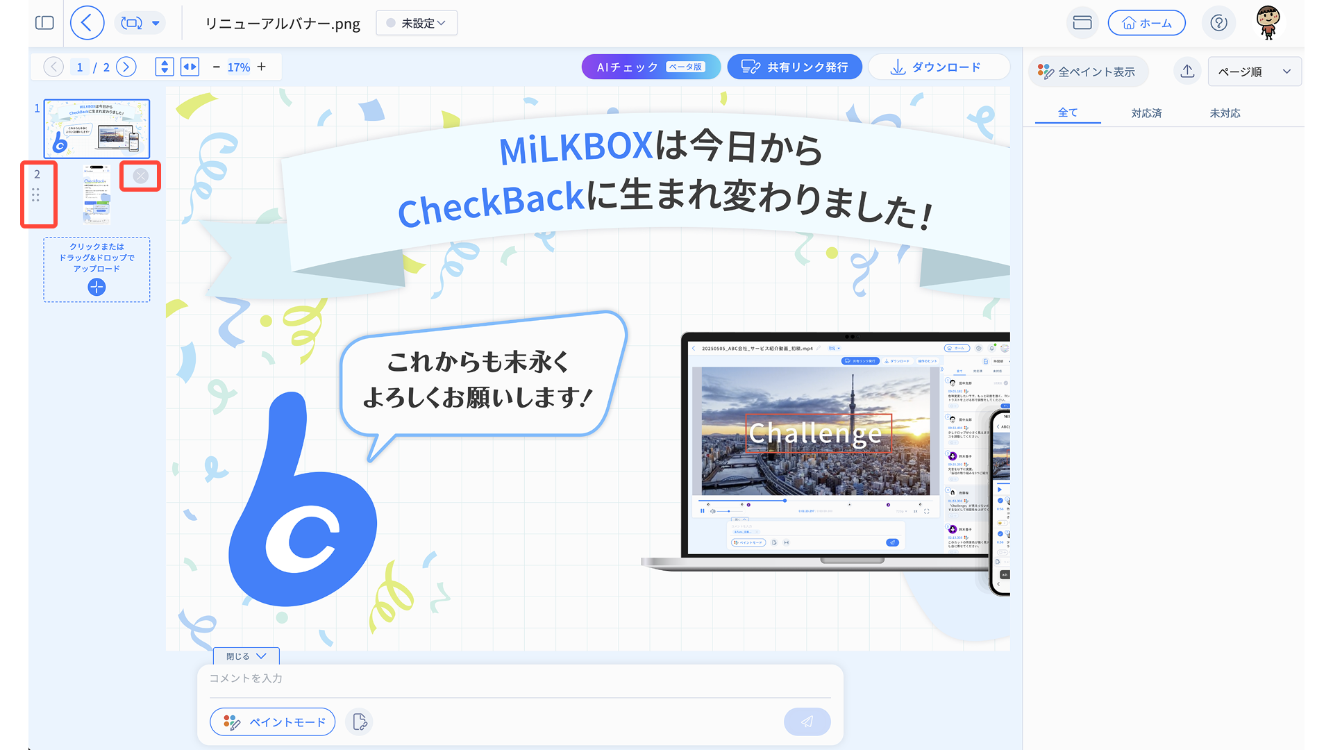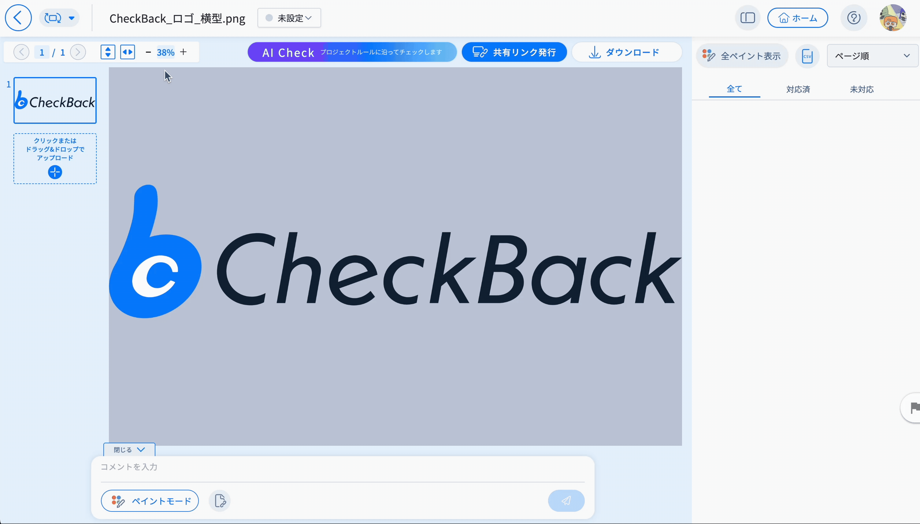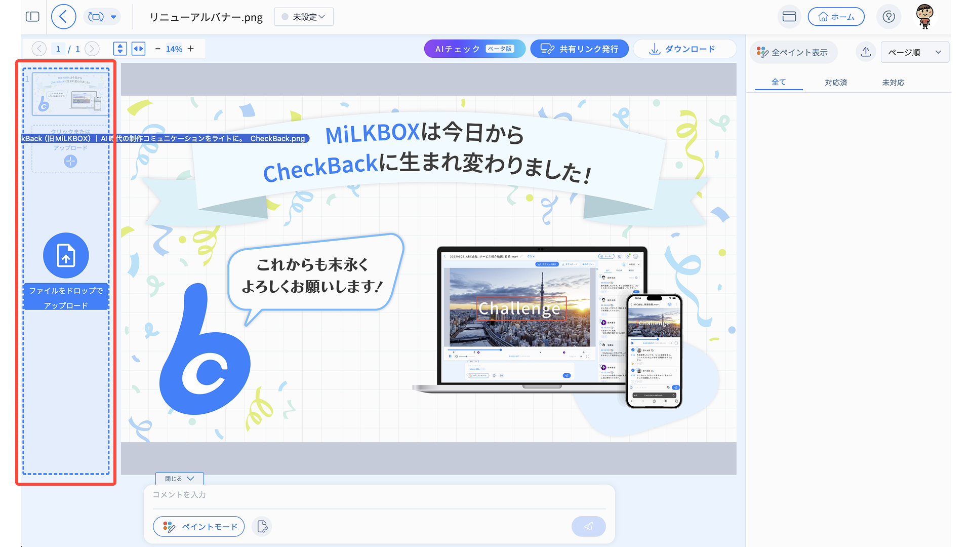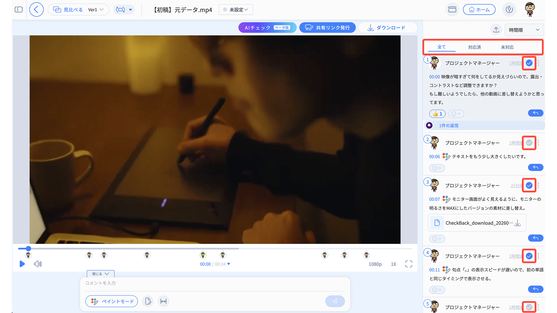 修正対応が完了したチェックバックコメントを「対応済」としておくことで、修正管理がしやすくなります。
