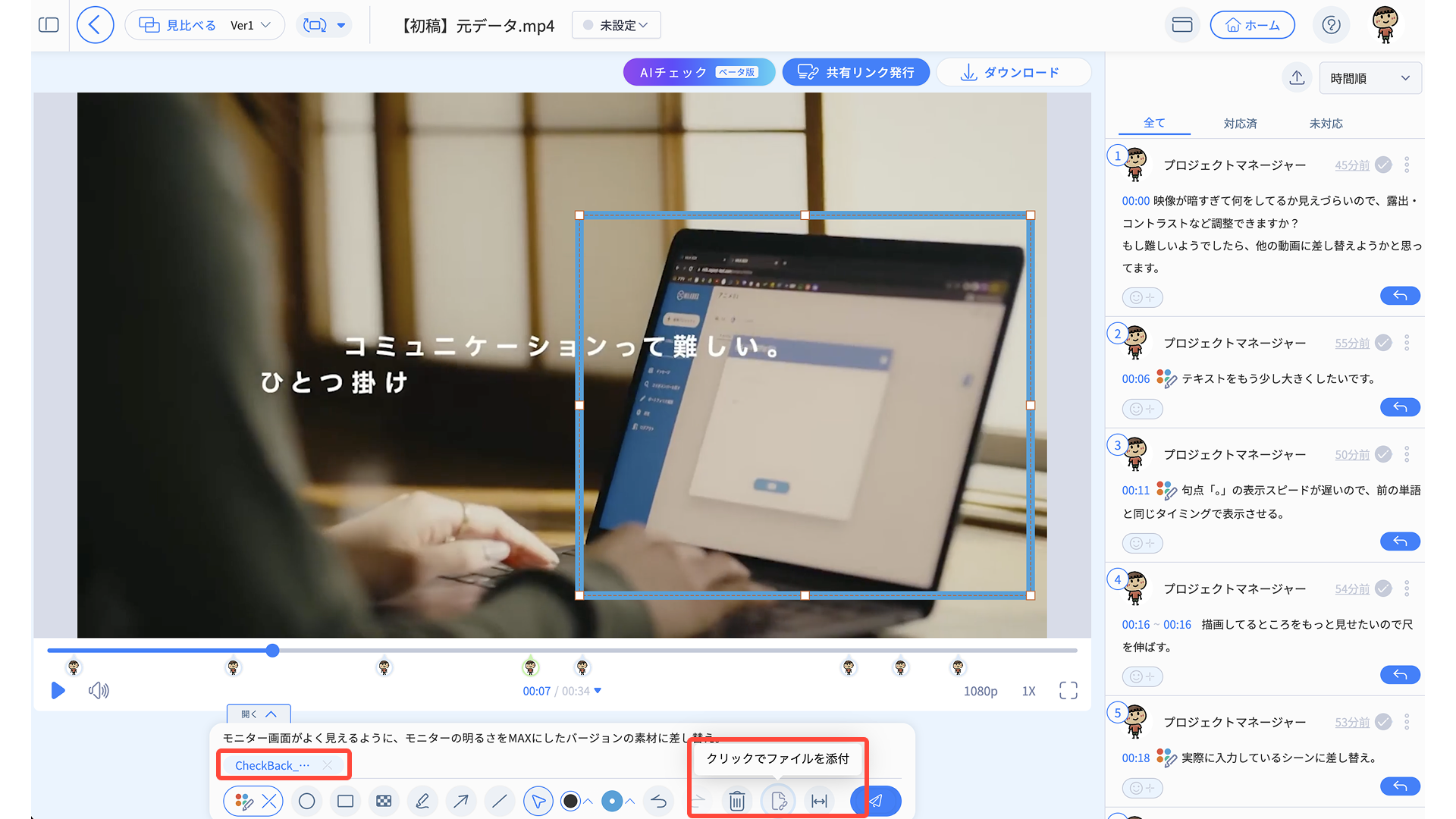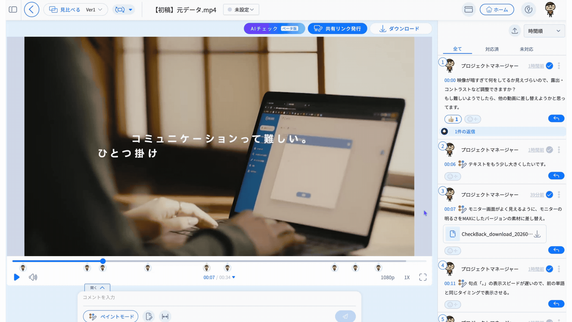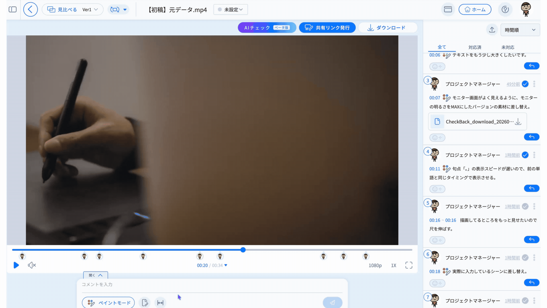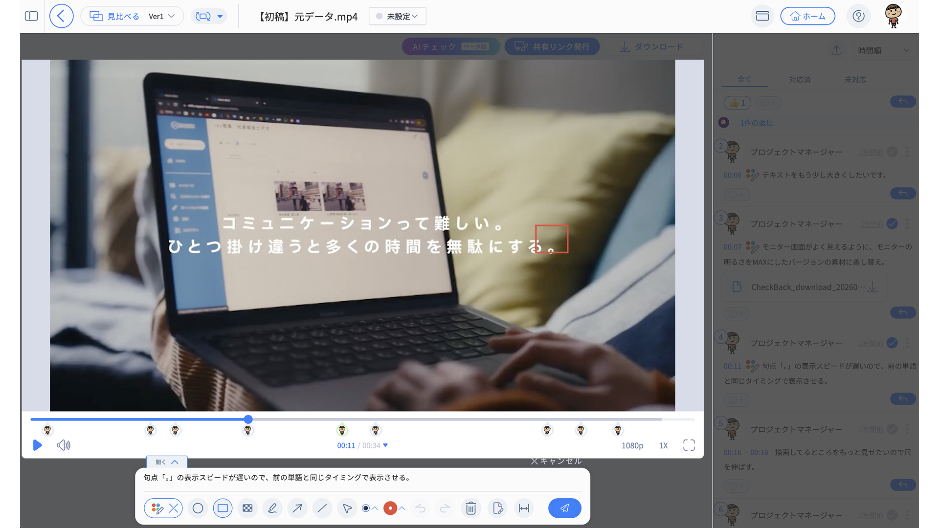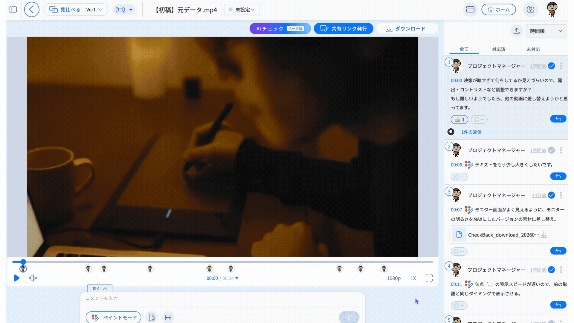 動画レビューではタイムラインを使ったチェックバックが可能です。