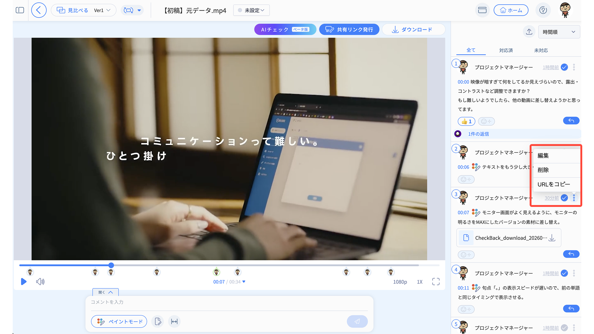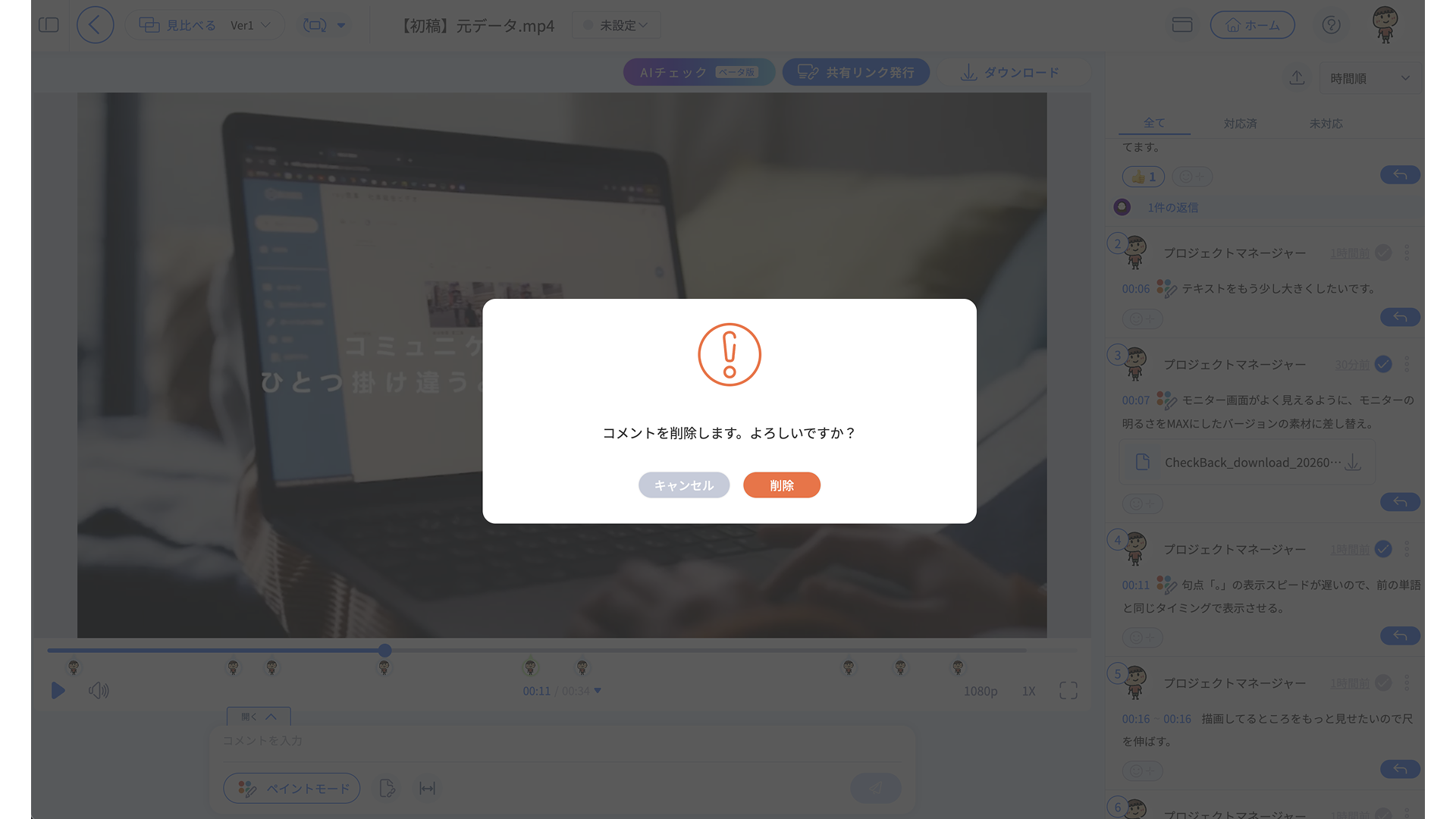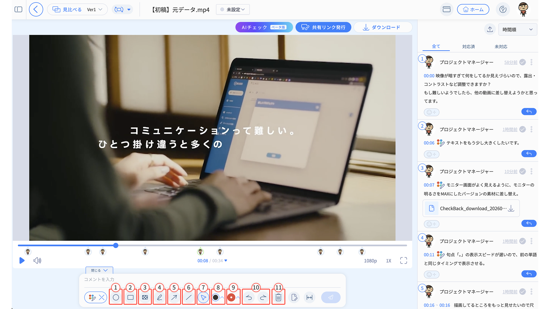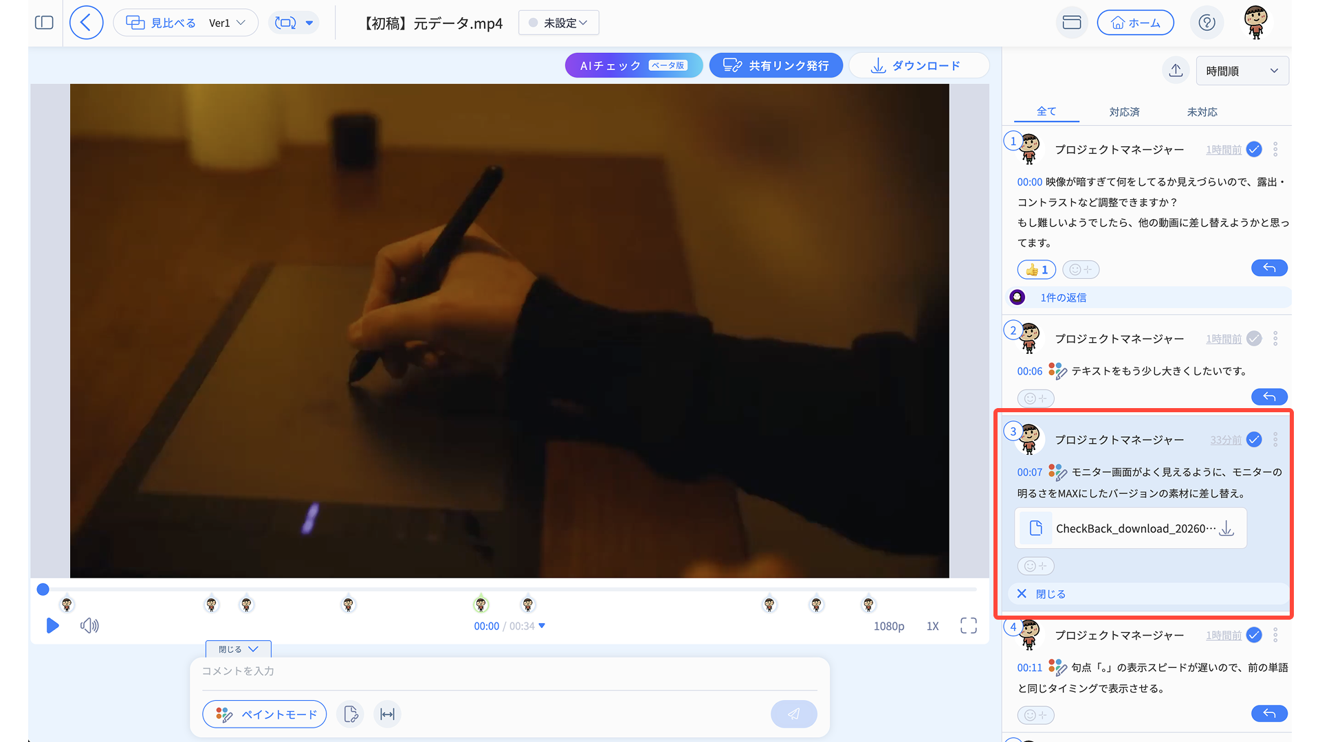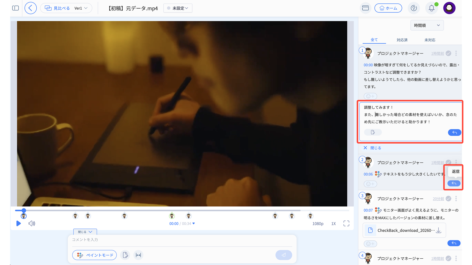 動画レビューではタイムラインを使ったチェックバックが可能です。