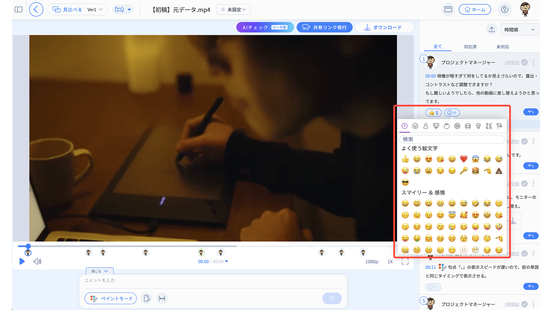 コメントの左下の絵文字マークをクリックして、任意の絵文字を選択することができます。