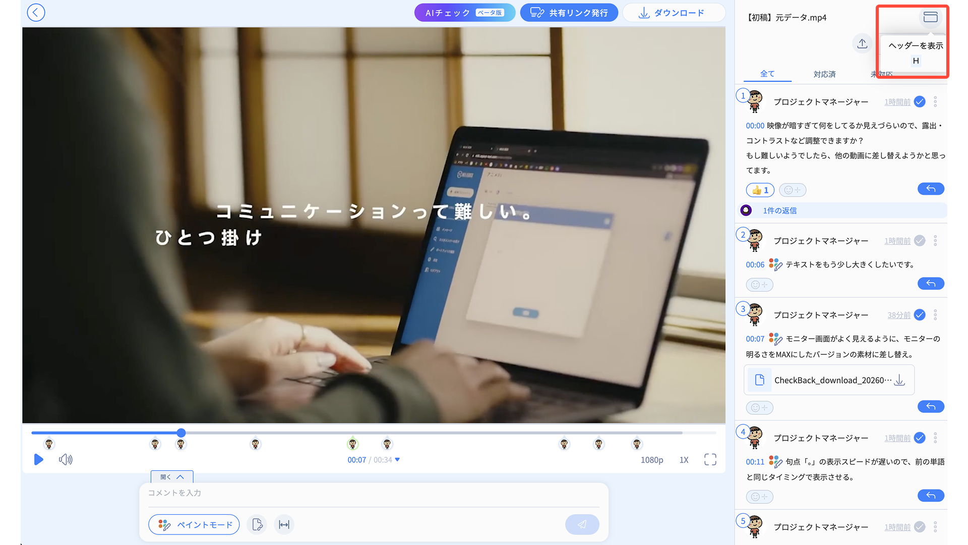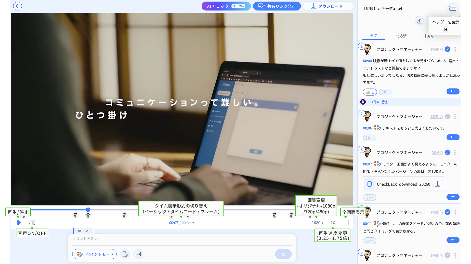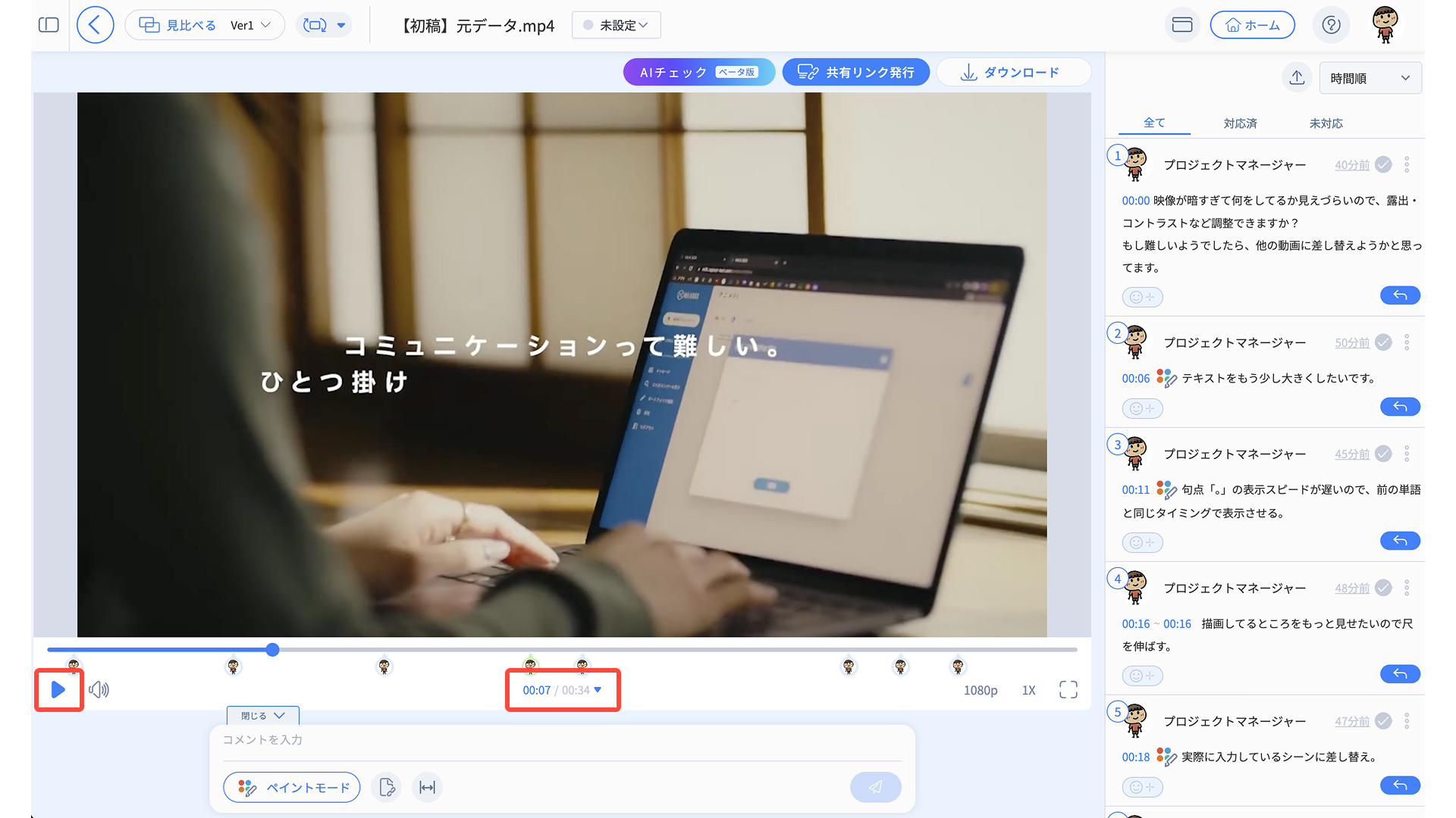 また、再生バー下に表示されるアイコンをクリックすると、タイムコードの移動に追従して該当のコメントが表示されます。