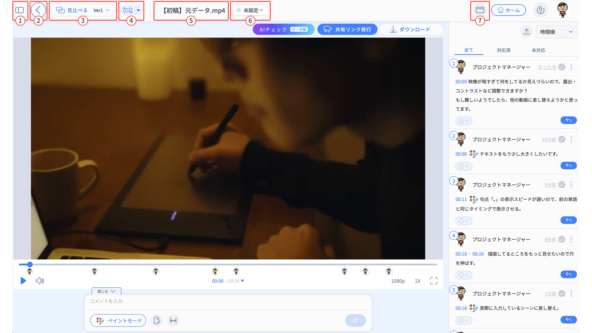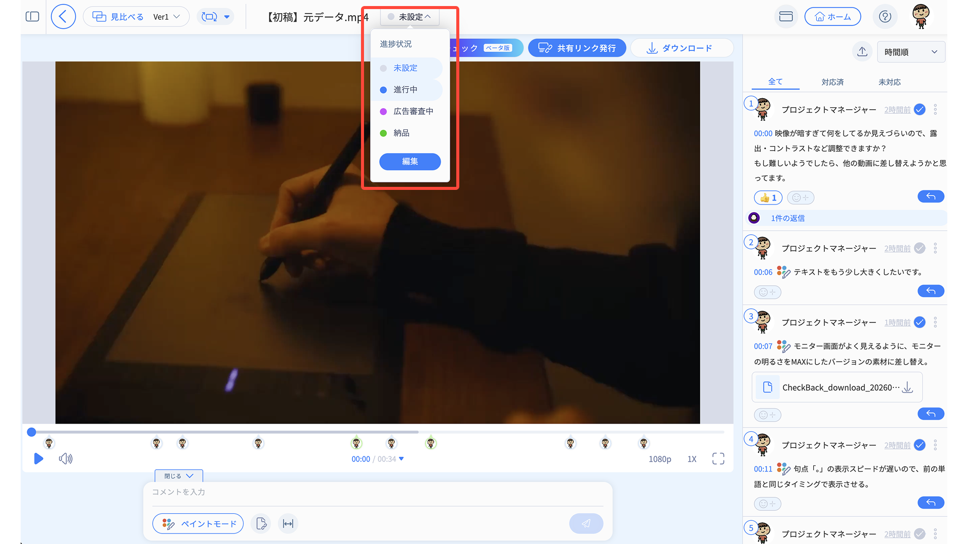 コメント送信の際、ペイント機能を使うことで制作物の上に直接修正指示を書き込めるため、テキストだけでは伝わりにくい修正箇所を視覚的に示すことができます。